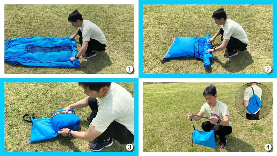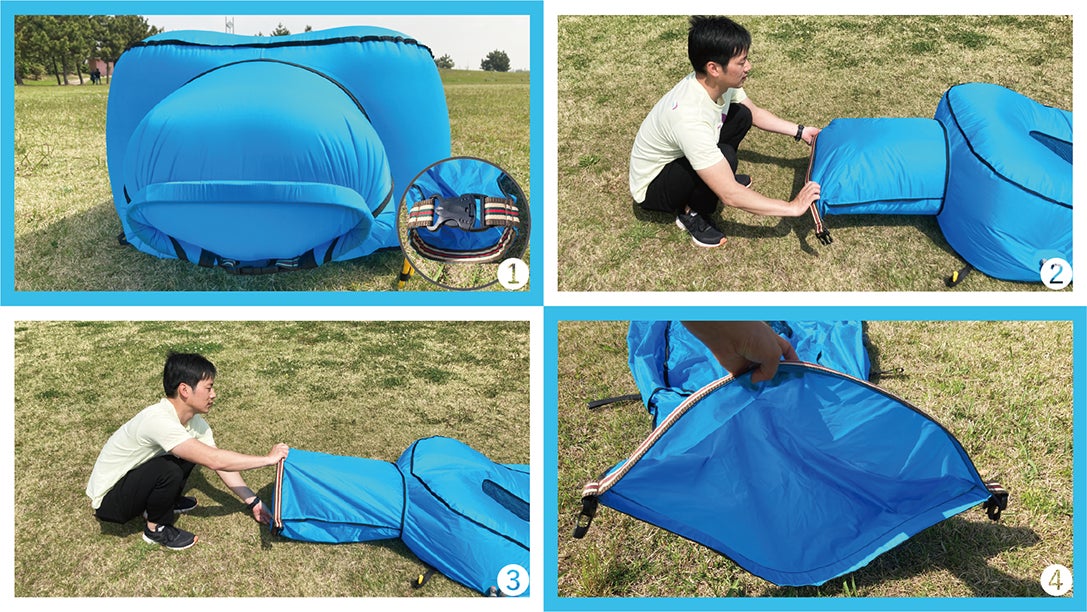 また、バックル式の空気口を開けると簡単に空気が抜けるので、使用時と同様に約60秒ほどで簡単に片付けることができます。収納時は、37×25×10㎝と肩掛けバッグほどのサイズまでコンパクトになり、省スペースで収納いただけるので自宅の防災グッズとしてもご利用いただけます。