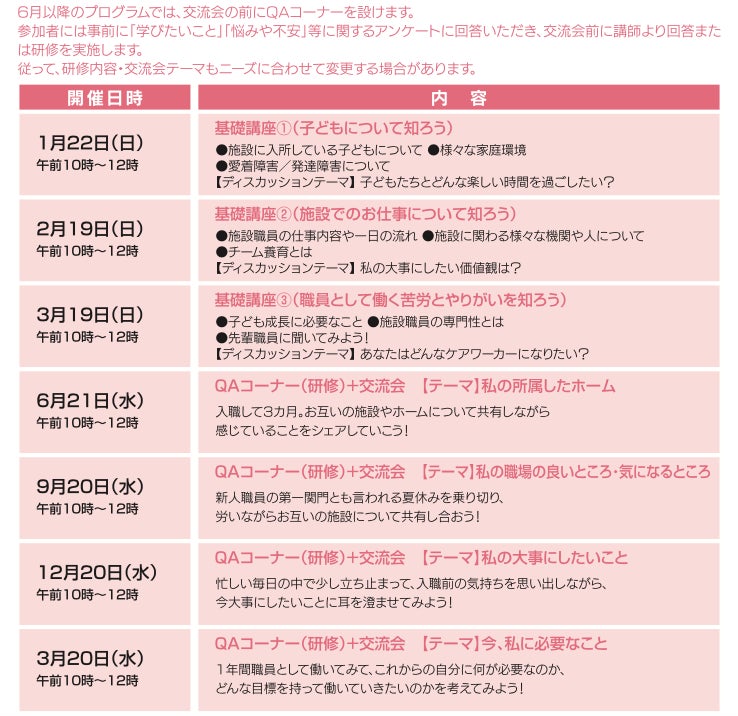 全7回の「チャボゼミ」のプログラムでは、施設職員へのアンケートで入職前に知っておきたかったこと・新任職員に学んでほしいことでともに1番ニーズが高かった「障害に関する研修(愛着・知的・発達・精神等)」への専門性の高い講師が担当。社会的養護の現場でよくあるケーススタディや基礎知識を学ぶ研修に加えて、参加者から寄せられた悩みや不安に答えるコーナーや、テーマを決めてお互いの想いをシェアしあう交流会も設けます。