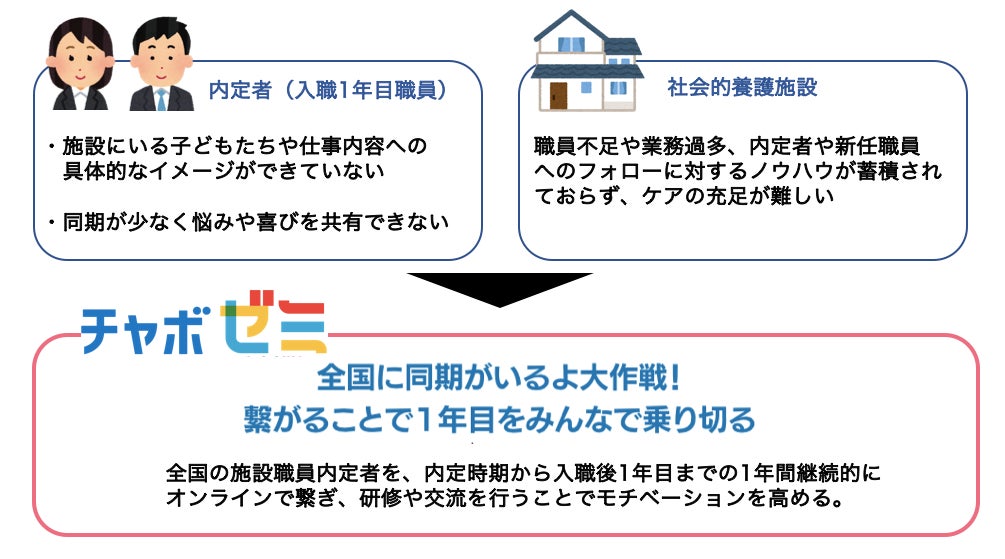 社会的養護の現場では、入職前に持っている現場のイメージと実際に働き始めて知ることや体験することのギャップに悩んだり同期が少なく不安や喜びを共有する機会が少ないことでモチベーションが保てず、入職して間もない職員が早期離職してしまうという課題があります。新人研修やOJT制度などを取り入れている施設もありますが人手不足や現場の業務量過多、内定者や新任職員へのフローに対するノウハウが蓄積されていなことで、十分なサポートが難しい施設も多くあります。