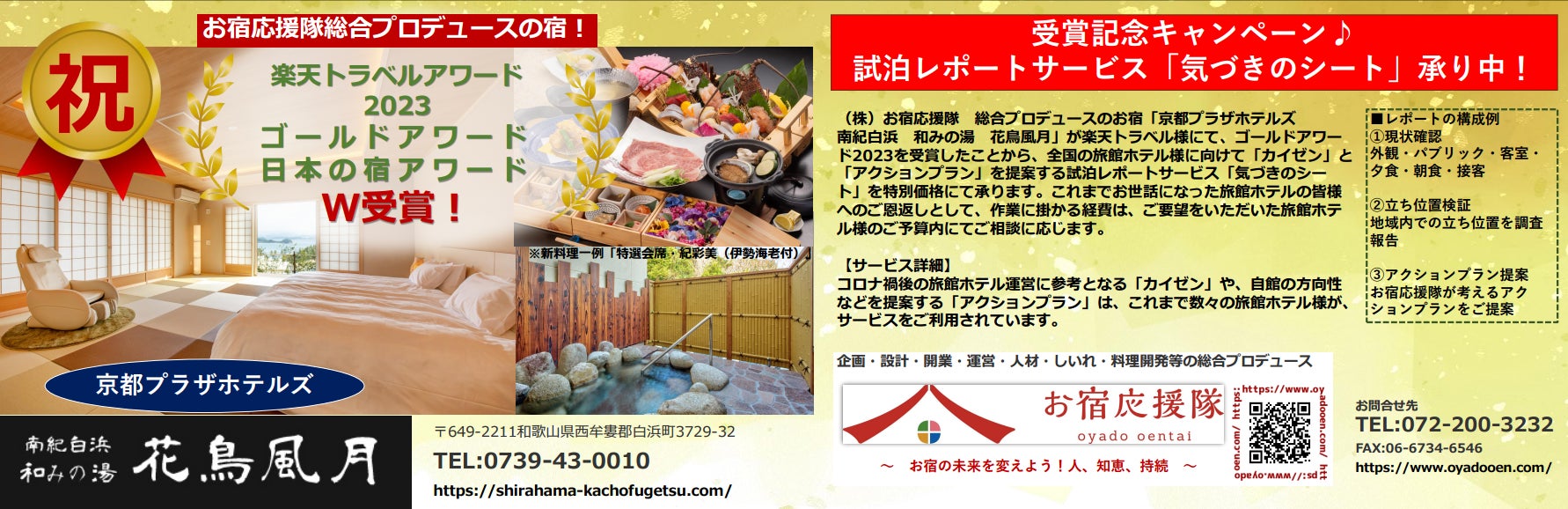 お宿応援隊総合プロデュースの宿!「南紀白浜 和みの湯 花鳥風月」楽天トラベル様にて楽天アワード2023「ゴールドアワード」「日本の宿アワード」W受賞