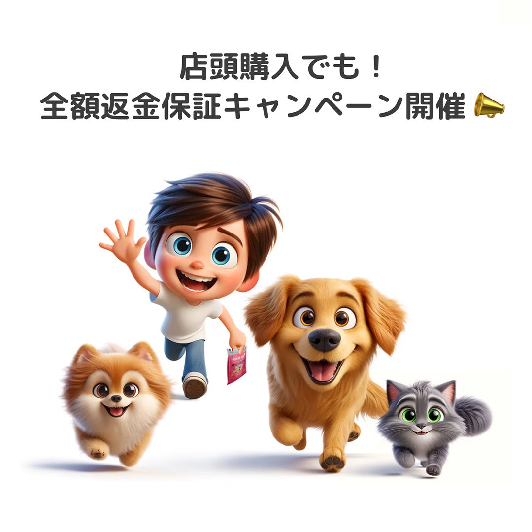ペットショップなどの店舗でも安心してご購入いただけるよう、初回購入に限り、ワンちゃんが食べなかったら全額返金します:レシート有効期限2025年2月1日(日)~2025年4月27日(日)