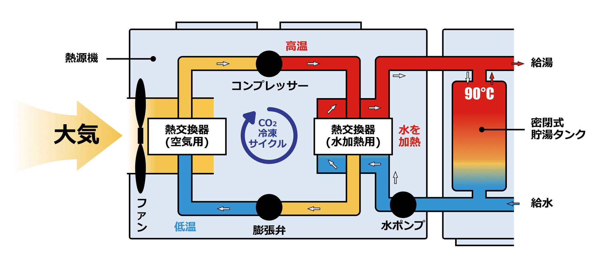 既設のガスや重油などの燃焼系ボイラーからエコキュートに変えることで、クリーンな給湯環境を構築することができます。イトミック業務用エコキュートは環境性とランニングコストの低減を考慮し、自然冷媒CO₂を使用して、ヒートポンプでお湯を沸かす給湯機です。