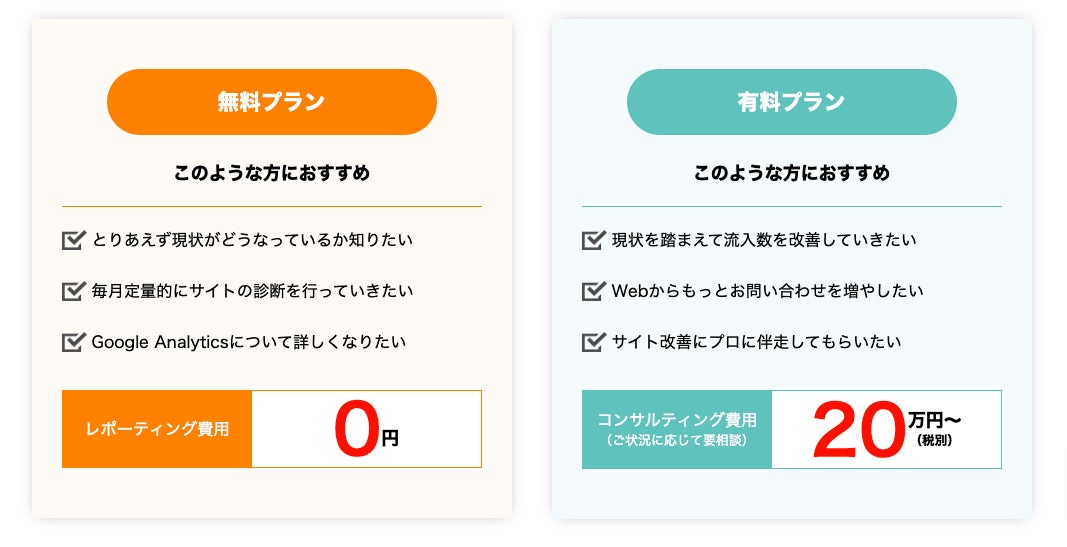 レポートのみであれば無料ですが、レポーティングの内容をもとにしたミーティングの実施、問題解決などのコンサルティングを受けたいという方向けには有料プランもご用意しています。