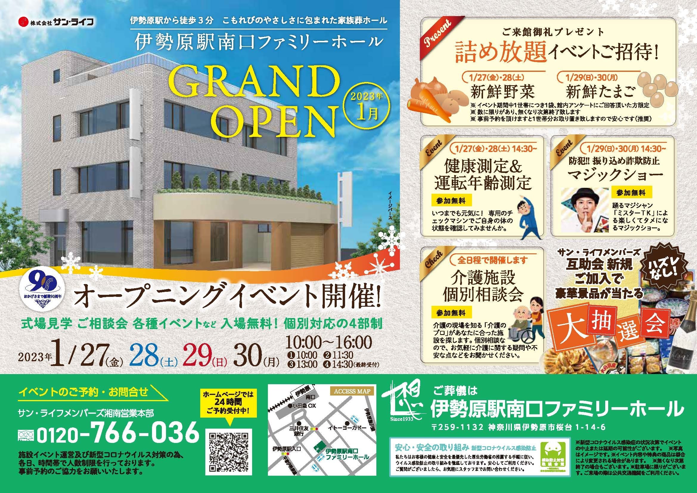 「サン・ライフ伊勢原駅南口ファミリーホール」は、オープンを記念してグランドオープンイベントを開催いたします。