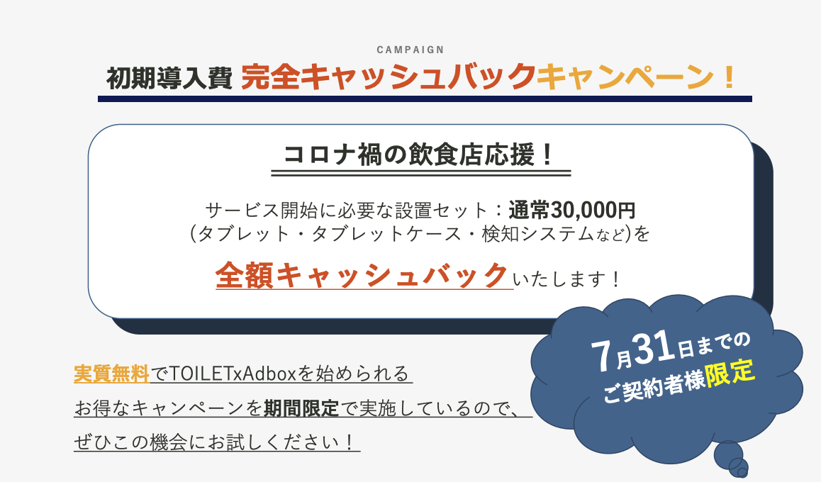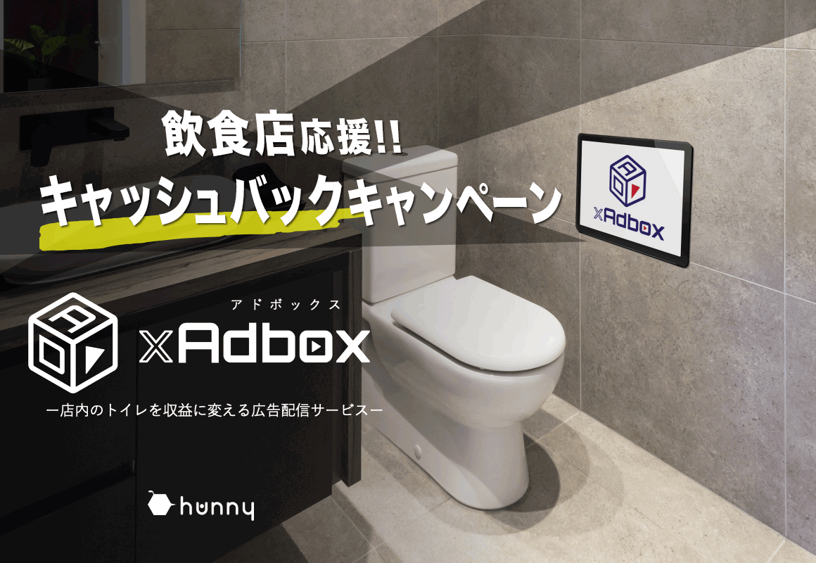 トイレの個室に動画広告配信するサービスTOILET xAdbox(トイレアドボックス)が「飲食店応援!初期費用全額キャッシュバックキャンペーン」を実施!