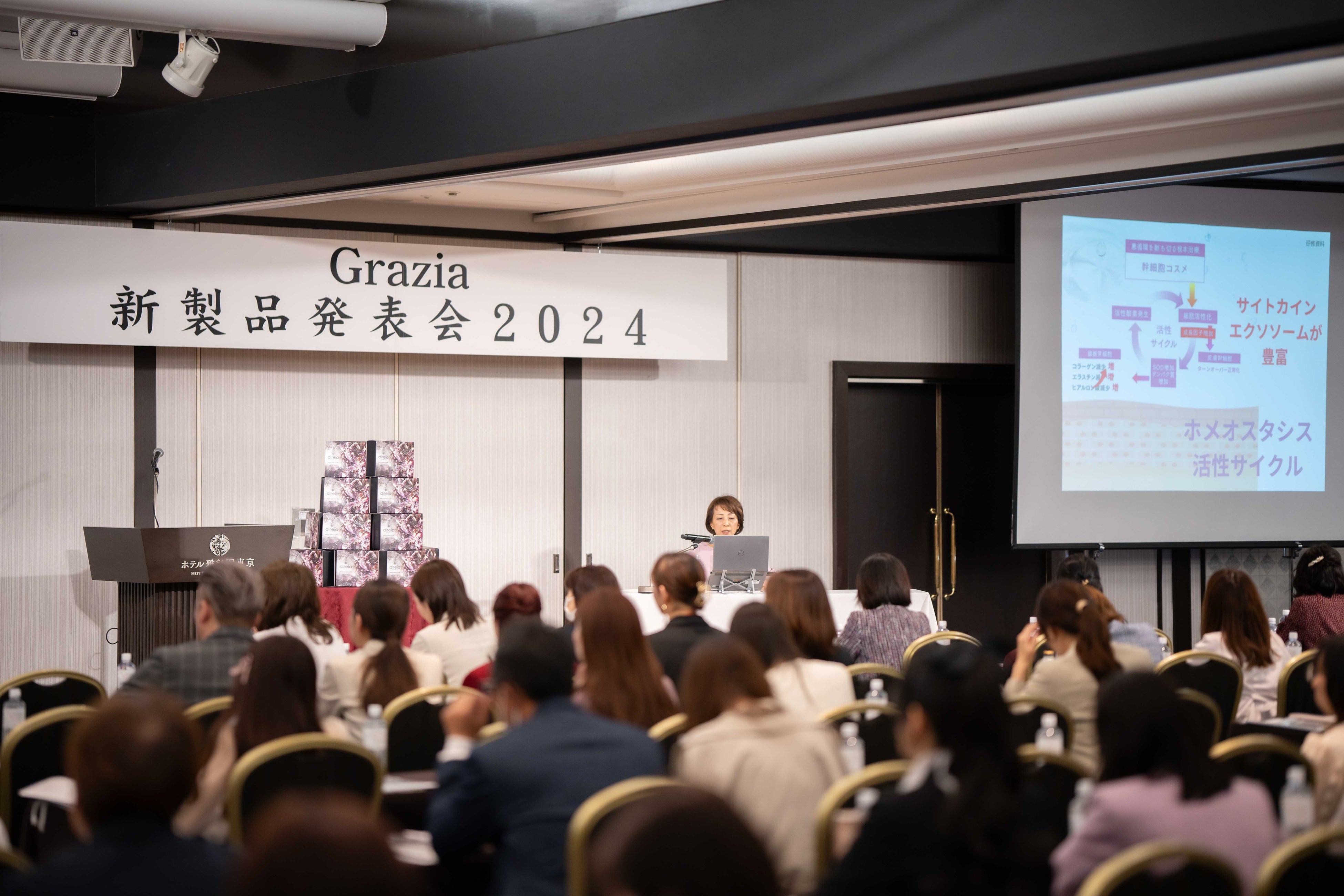 ヒト幹細胞培養液コスメディレイアから新ラインとなるプレミアシリーズや、美容医療向け製品、インナービューティーのパイオニア・株式会社プロラボホールディングスとの共同開発製品など、全4製品をリリース発表いたしました。参加者数は250名と満員御礼での開催となりました。