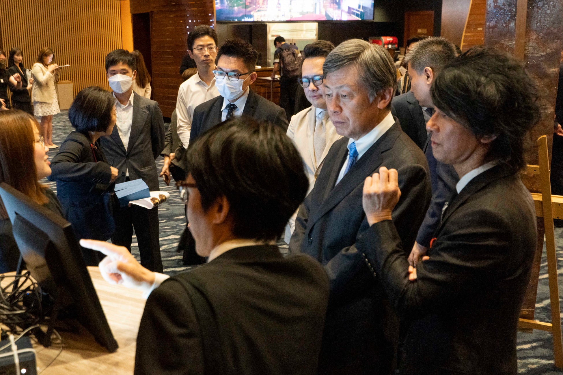 ホワイエでのタッチパネルによる実演(写真中央:在香港日本国総領事館岡田健一総領事(大使))