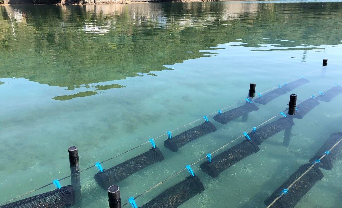 リブルのあまべ牡蠣は、従来からのイカダから牡蠣を海中に吊り下げる「垂下式」ではなく、牡蠣をカゴに入れて1個ずつバラバラで養殖する「シングルシード式」で育てています。シングルシード式を用いることで、養殖に向かない綺麗な海でも牡蠣を育てていく事が出来ています。