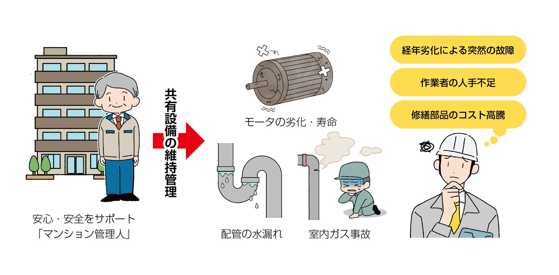 国内にマンションは670万戸以上存在します。居住者数では1,500万人を超え、国民の1割超がマンションに居住している推計になります。そのマンションには多数の共用設備があり、居住者の快適な生活には不可欠となっています。一方で設備管理を担う管理会社においては、点検業務員の人手不足、人件費などの労務コスト、保守部材の高騰が合わさり管理費・修繕積立費の未払いや値上げ交渉などが課題となっています。