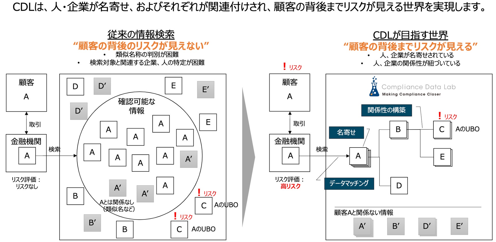 CDLは、情報ソースの拡充に加え、従来の情報検索において、類似名の判別が困難であったり、検索対象と関連する企業、人の特定が困難であるといった「顧客の背後のリスクが見えない」という課題を解決し、膨大なデータの中で、人・企業が関連付けされ、「顧客の背後までリスクが見える世界」を実現します。