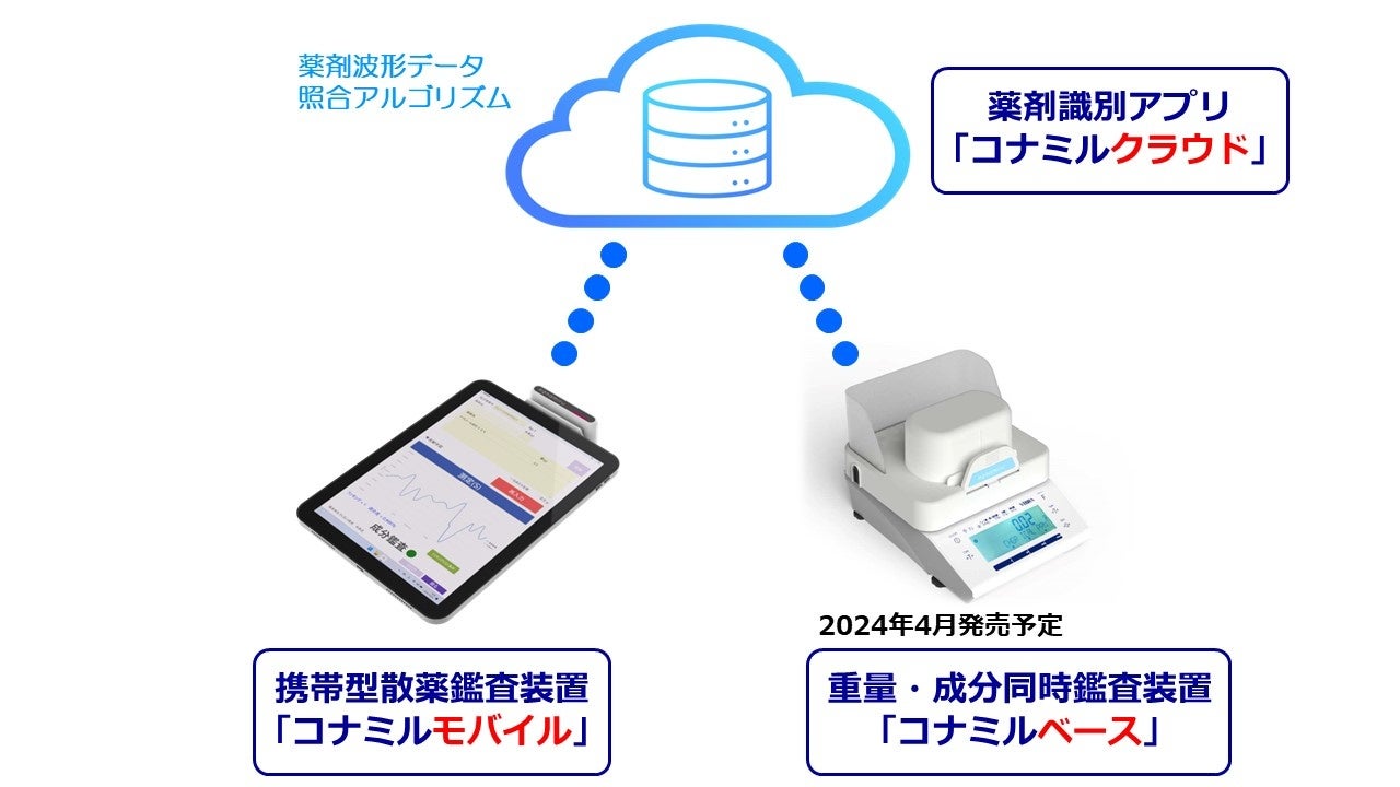 今回リリースとなるのは、携帯型散薬鑑査装置「コナミルモバイル」および薬剤識別アプリ「コナミルクラウド」の2点です。重量・成分同時鑑査装置「コナミルベース」につきましては、現在当社にて開発中であり、2024年4月のリリースを目指しています。