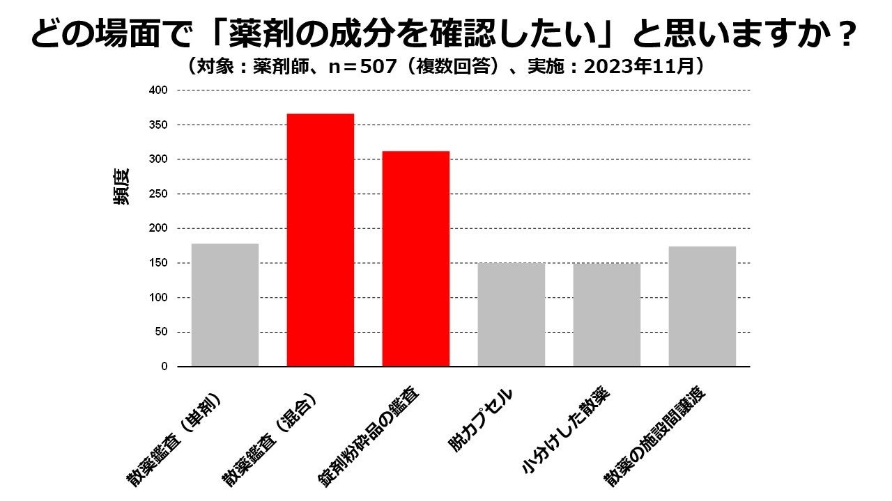 散薬や錠剤粉砕品は目視判別が困難であり、一包化した後に内容薬剤の成分を確認する効果的な方法がこれまでなかったことも、これらの調剤に関わる不安を招いている一因でもあります。一包化後に内容薬剤の成分確認(成分鑑査)が簡易にできれば、薬剤師が散薬や錠剤粉砕調剤に関する心理的および時間的負担から解放され、薬剤師が対人業務に集中できる環境が構築できると考えられます。