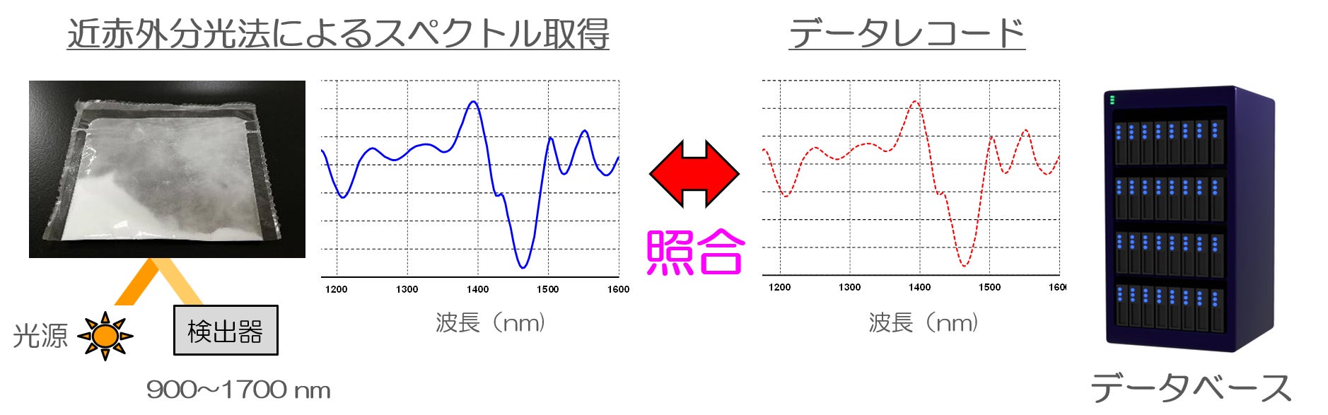 当社では、上記の課題を解決するため、近赤外分光法という分光分析手法を応用した散薬鑑査装置を開発しました。一包化した散薬あるいは錠剤粉砕品に対して分包フィルムの外部から近赤外線を照射し、その反射波を測定すると、内部の成分に対応した波形データ(近赤外吸収スペクトル)が得られます。この波形データをあらかじめデータベースに登録している波形データと照合することによって、一包化後の散薬の成分を鑑査します。