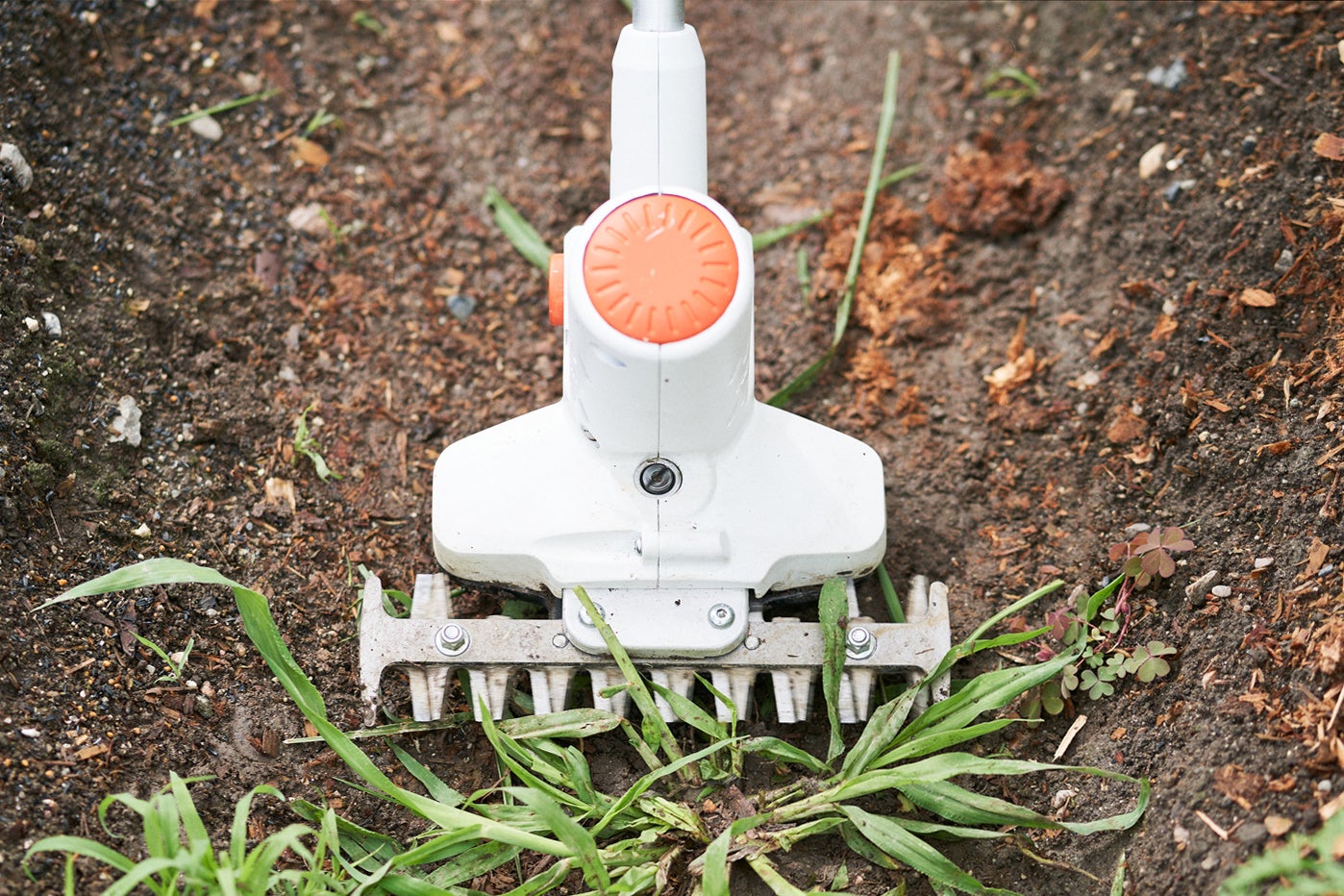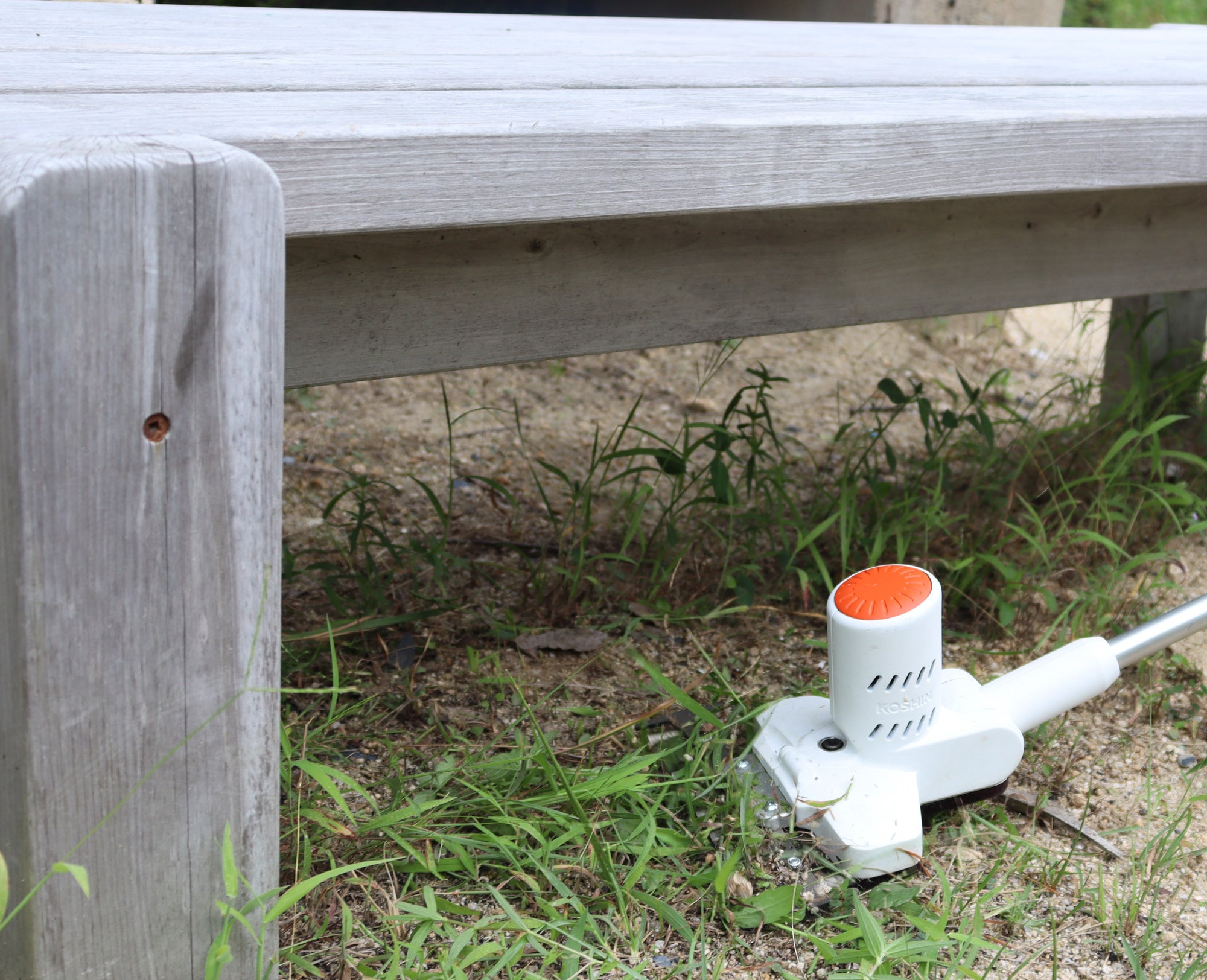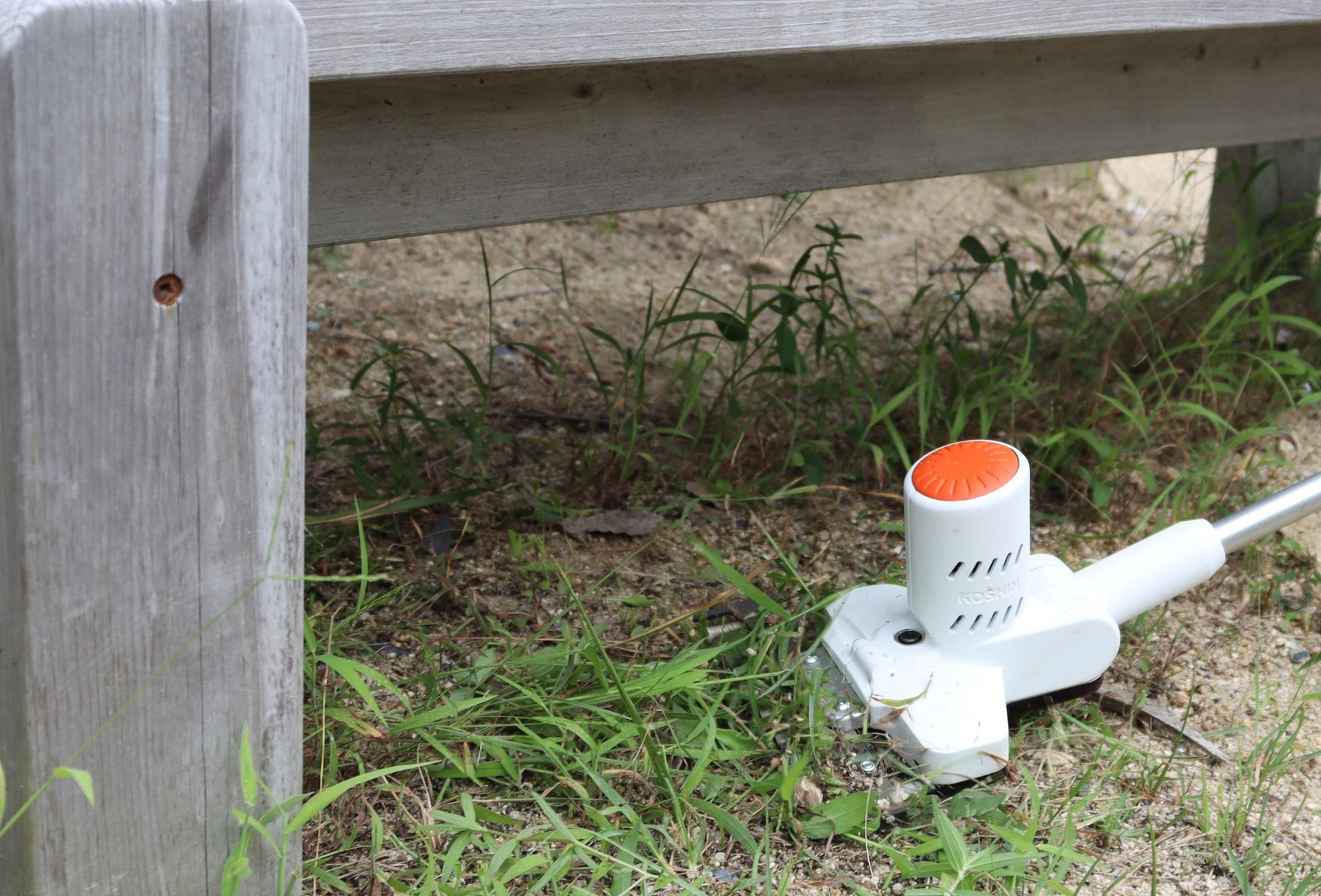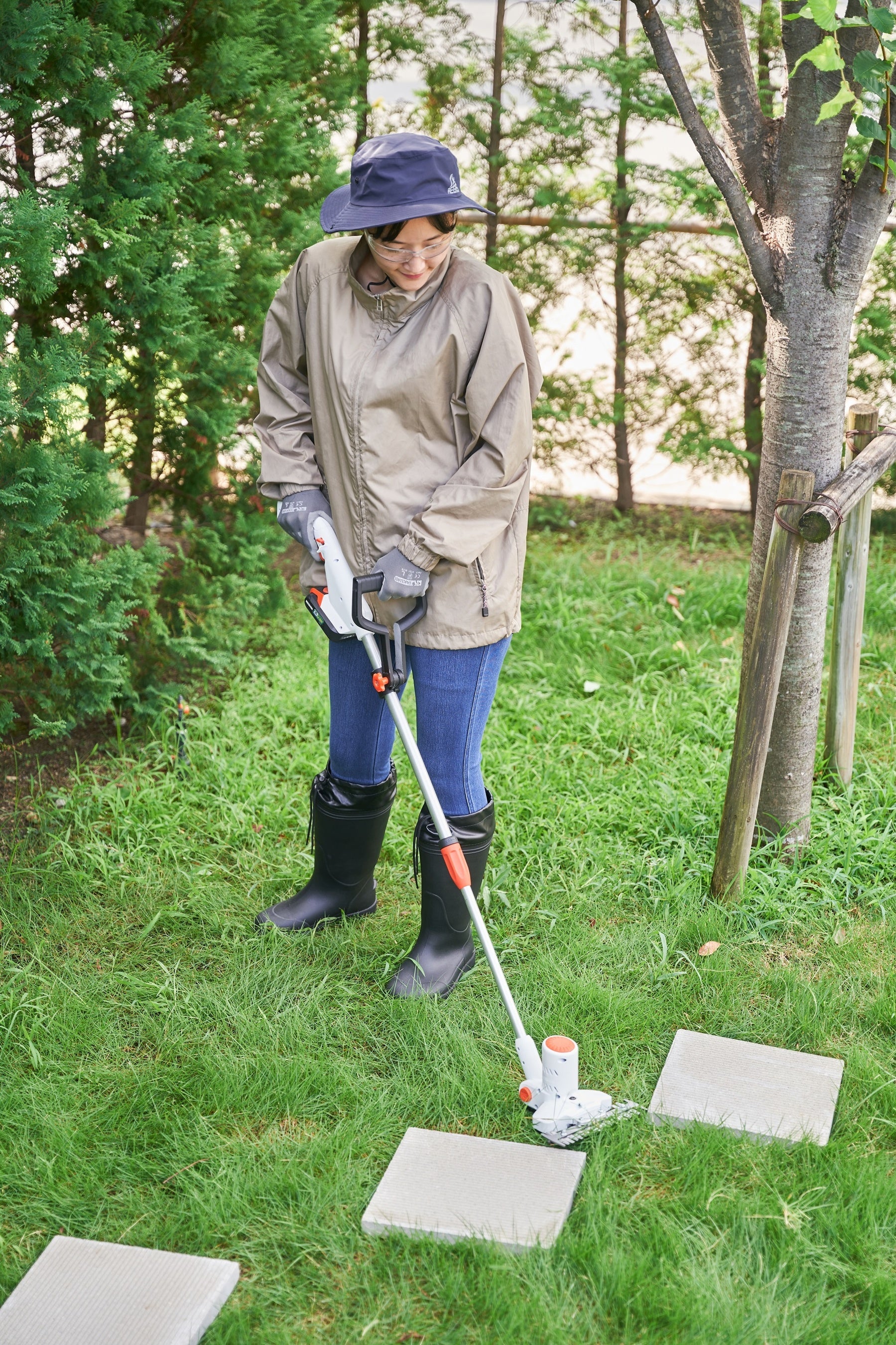 花壇の狭い通路や、際の雑草除去も掃除機のように押すだけで簡単に刈ることができます