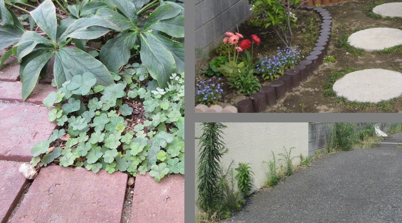 花壇の脇、駐車場の目地、道路との間、砂利の端など。。