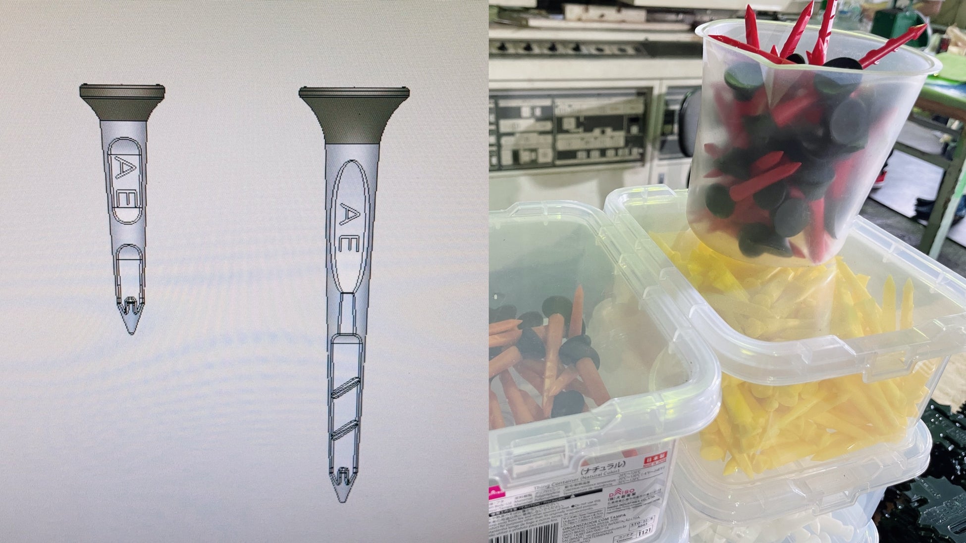 当製品の最大の特徴として、ティーのヘッドに「熱可塑性エラストマー」を使用しています。ティー本体とヘッドの成形を2回に分けることで、製造を実現しました。