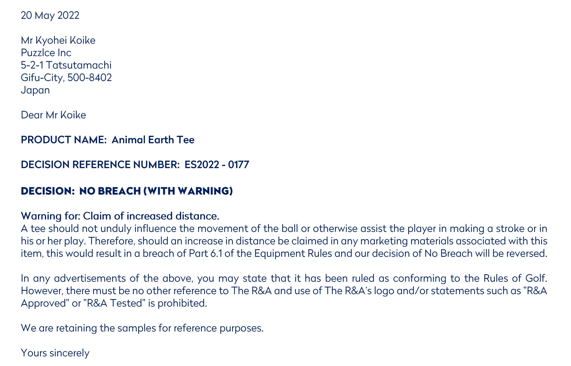「Animal Earth Tee」は、正式な検査期間の元、『ゴルフ規則適合品』の認証を得ています。