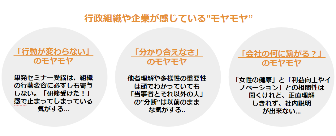 私たち株式会社陽と人と株式会社ライフサカスは、これまでに女性の健康課題に関する研修を企業や自治体で実施してきましたが、同時に男女問わず、様々な胸の内・モヤモヤも伺ってきました。