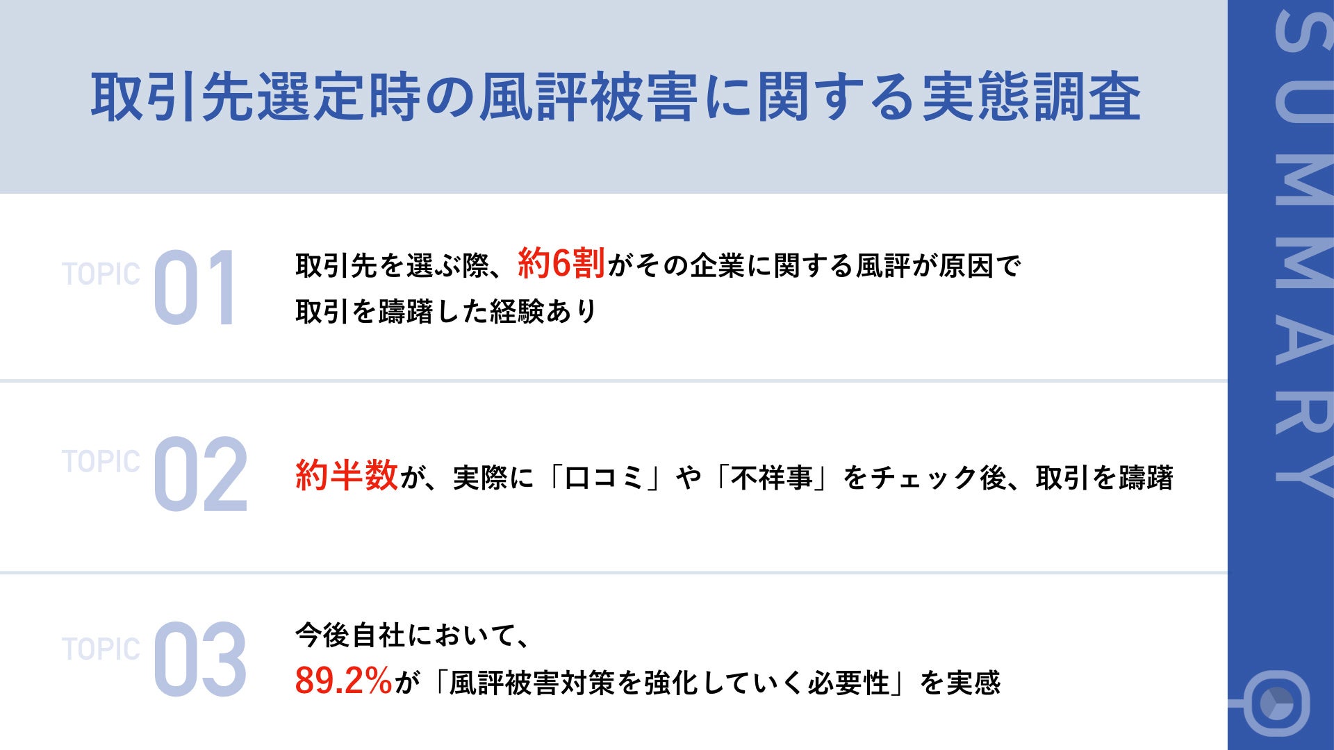 インターネットで情報収集することが主流になる今、大手企業の管理職が取引先を選ぶ際にも、「口コミ」や「不祥事」などをチェックすることが分かりました。さらには、約6割がその企業に関する風評が原因で取引を躊躇した経験を持つことが分かりました。また、風評被害は「業績に直結すると思うから」や「採用に影響すると思うから」などの理由から、今後自社においても、89.2%が「風評被害対策を強化していく必要性」を実感していることが明らかになりました。