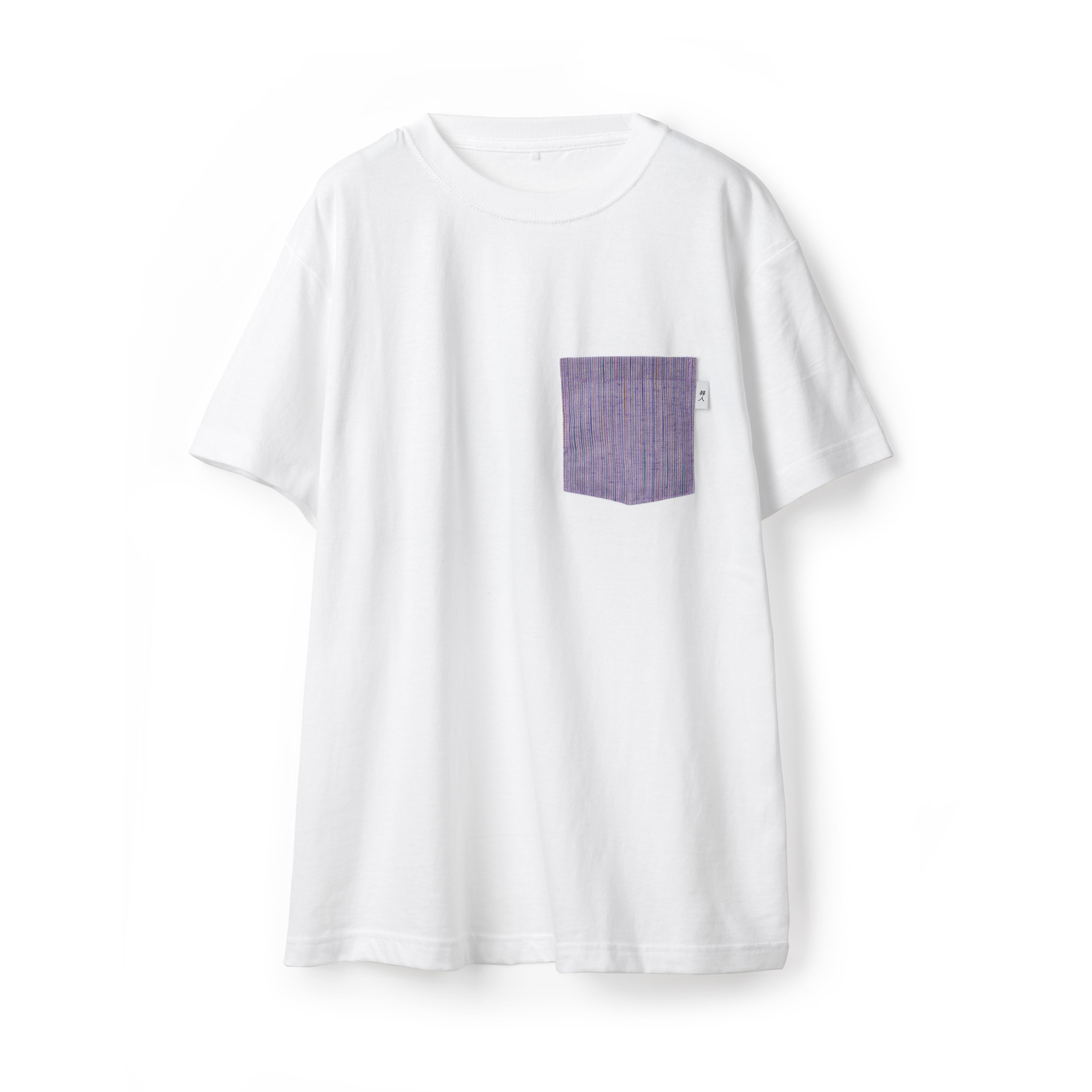 布地の端切れからポケットのパターンを切り出し、胸にあしらった、つぎはぎポケットTシャツ。