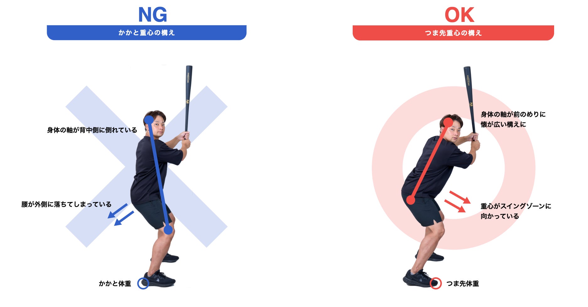 「身体の開き」は構えの時点で決まっており、「身体の開き」を起こす最大限の原因は “かかと重心” にあります。“つま先重心で構える”だけで身体の開きを未然に防ぐことができます。