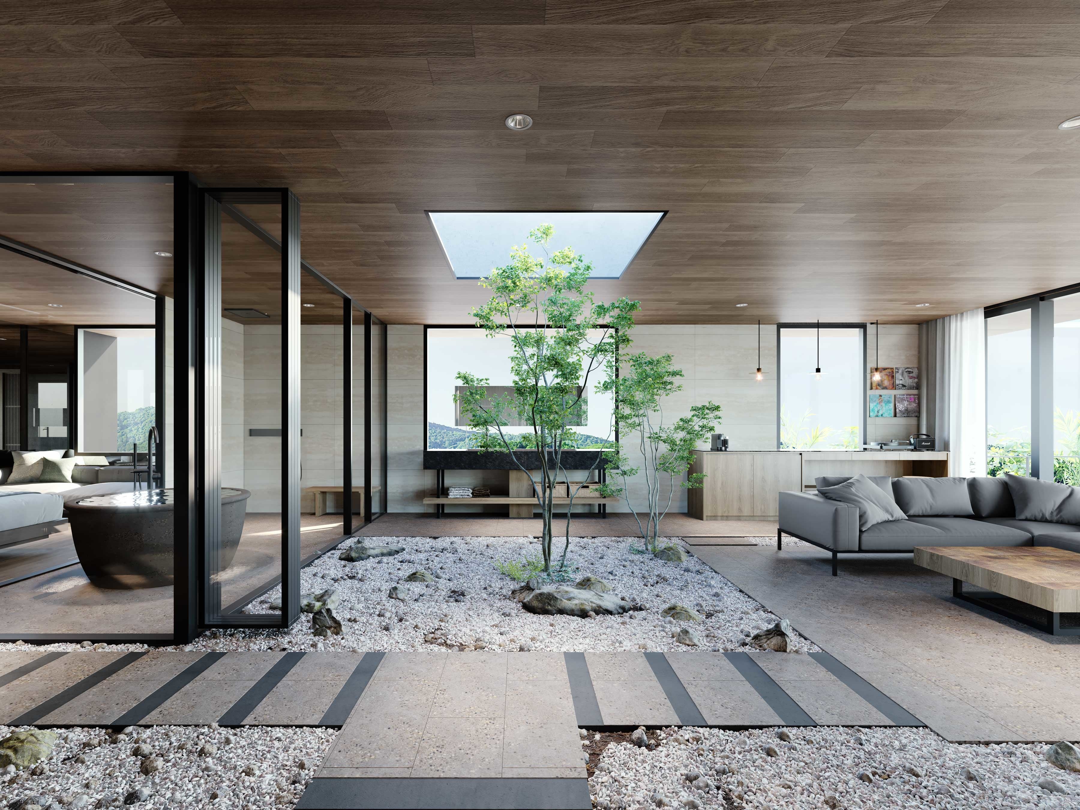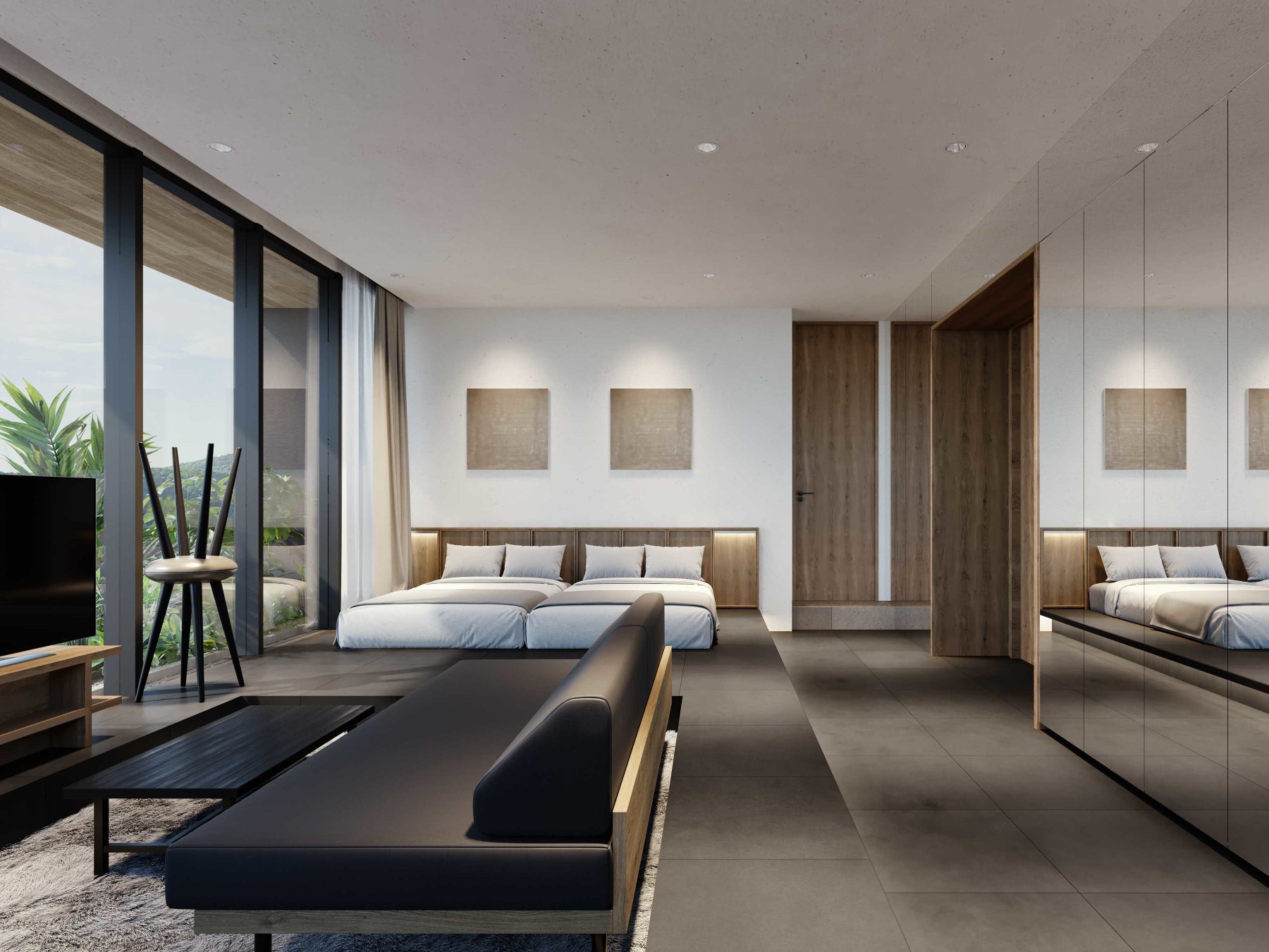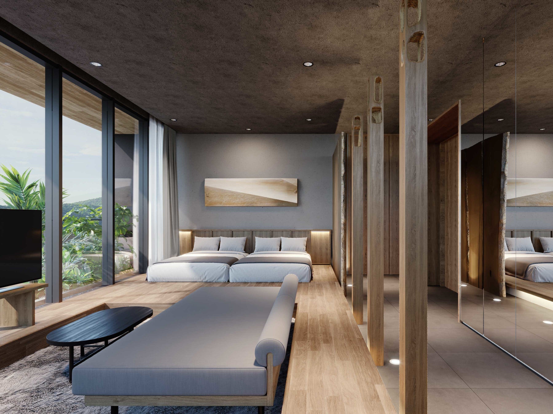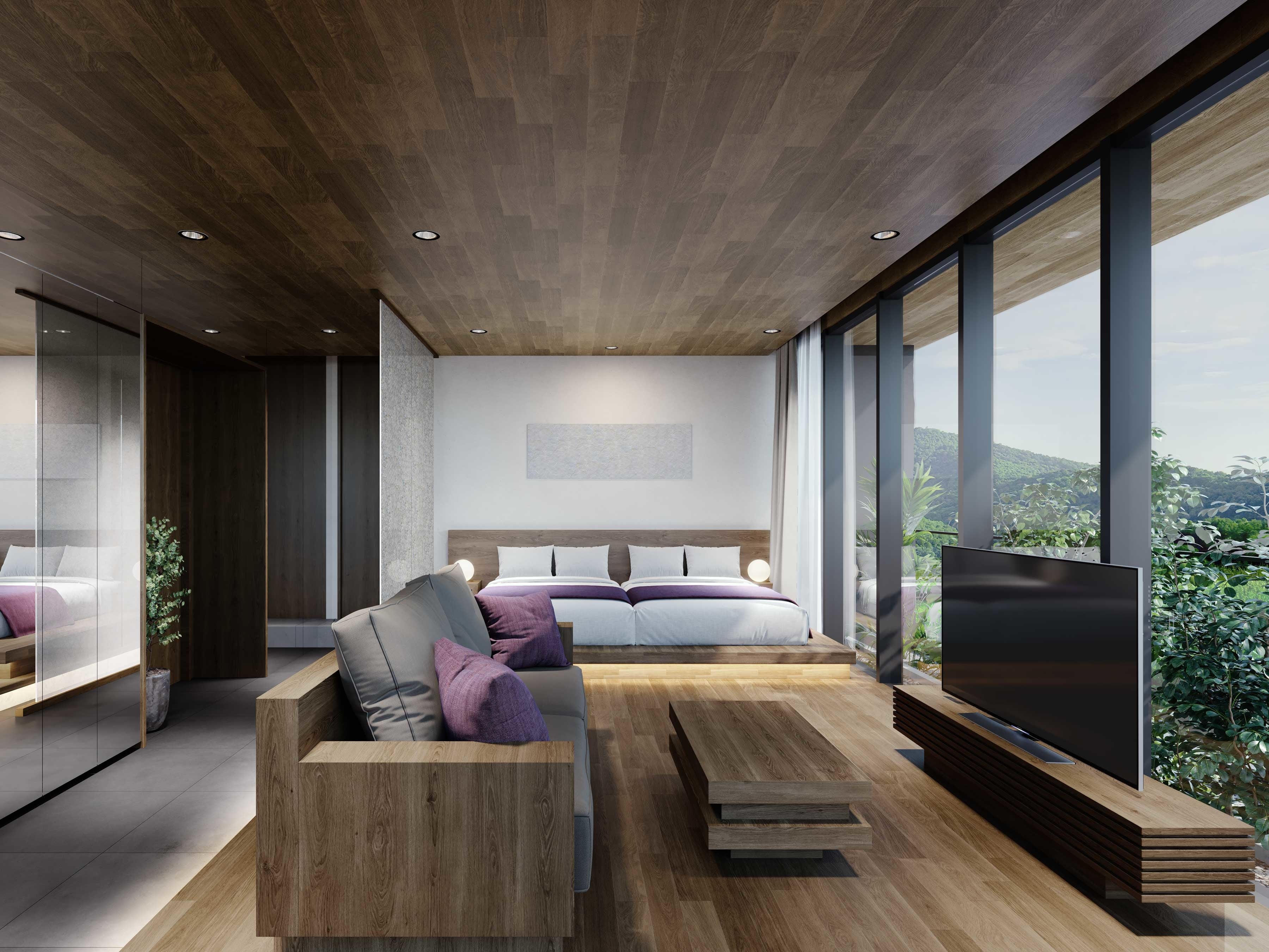 コンセプトである「STAGE」をデザイン意匠に落とし込み、小上がりを設えたツインルーム。