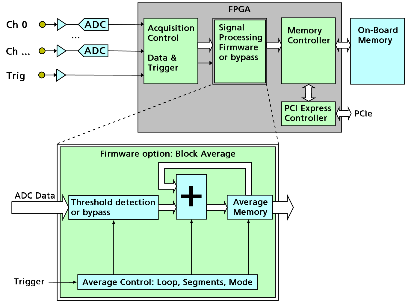 平均化処理機能は、不要な信号ノイズを低減すると同時に、測定分解能、ダイナミックレンジ、および信号対雑音比(SNR)を改善するのに役立つツールです。この新しいオプションにより、M5iデジタイザは、高度なオンボードのフィールドプログラマブルゲートアレイ(FPGA)技術を利用して、平均化機能を実行することができます。これにより、独自の提案が可能になります。M5iシリーズのデジタイザは、12ビットの分解能で最大6.4GS/sの速度でリアルタイムサンプリングを提供し、取得したすべてのデータを記録破りの12.8GB/sでPCIeバスを介して直接ストリーミングすることができます。この卓越した機能は、新しいファームウェアオプションによってさらに強化され、取得した信号を毎秒1,500万イベントという驚異的な速度で平均化することができます。