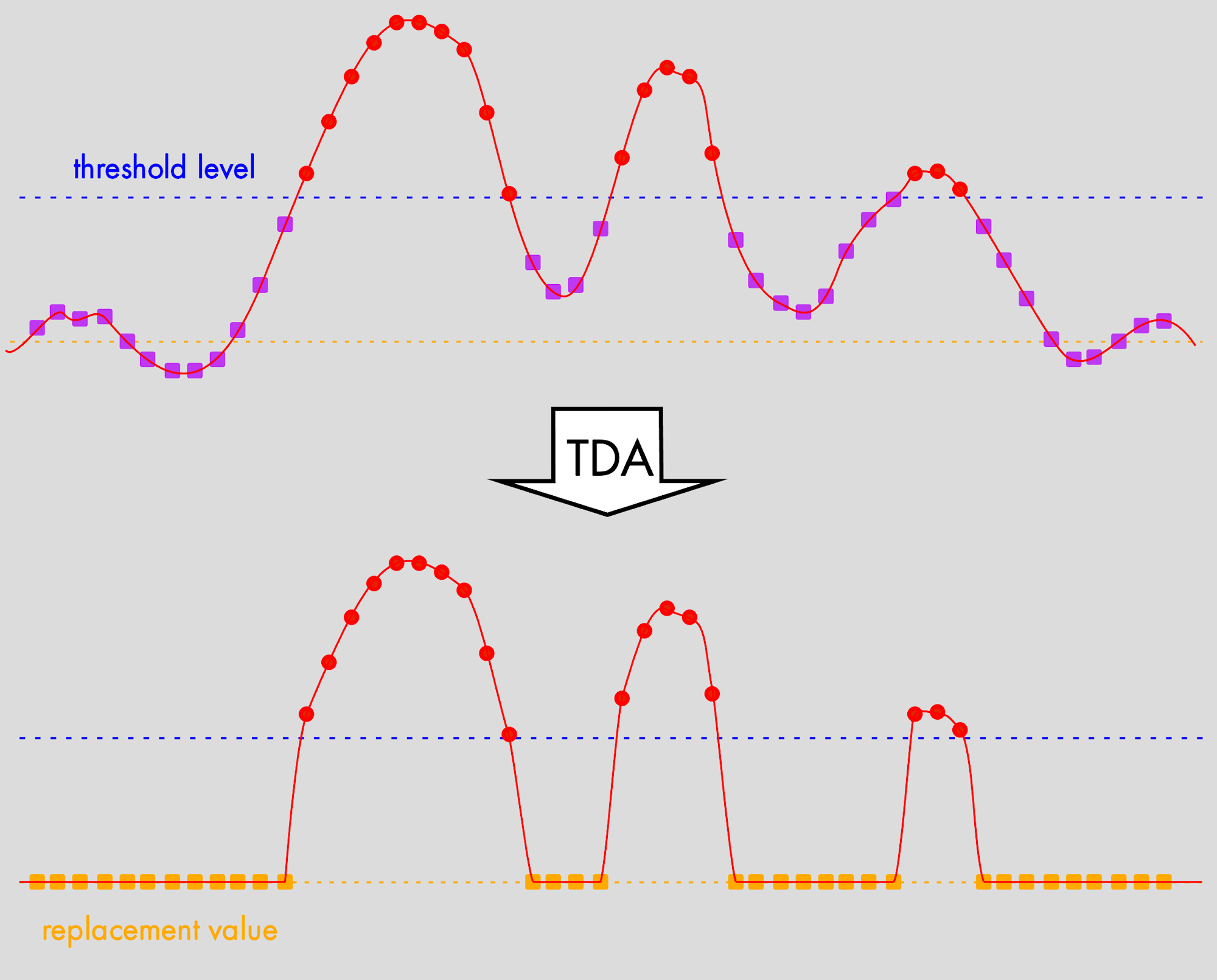 しきい値を下回る波形データは、平均化された波形から削除されるため、TDAは、低レベルの相関(同期)ノイズや、ベースラインドリフトのような他の波形要素を除去するための極めて有効なツールになります。これらは、従来の加算平均化処理では除去できない信号異常です。