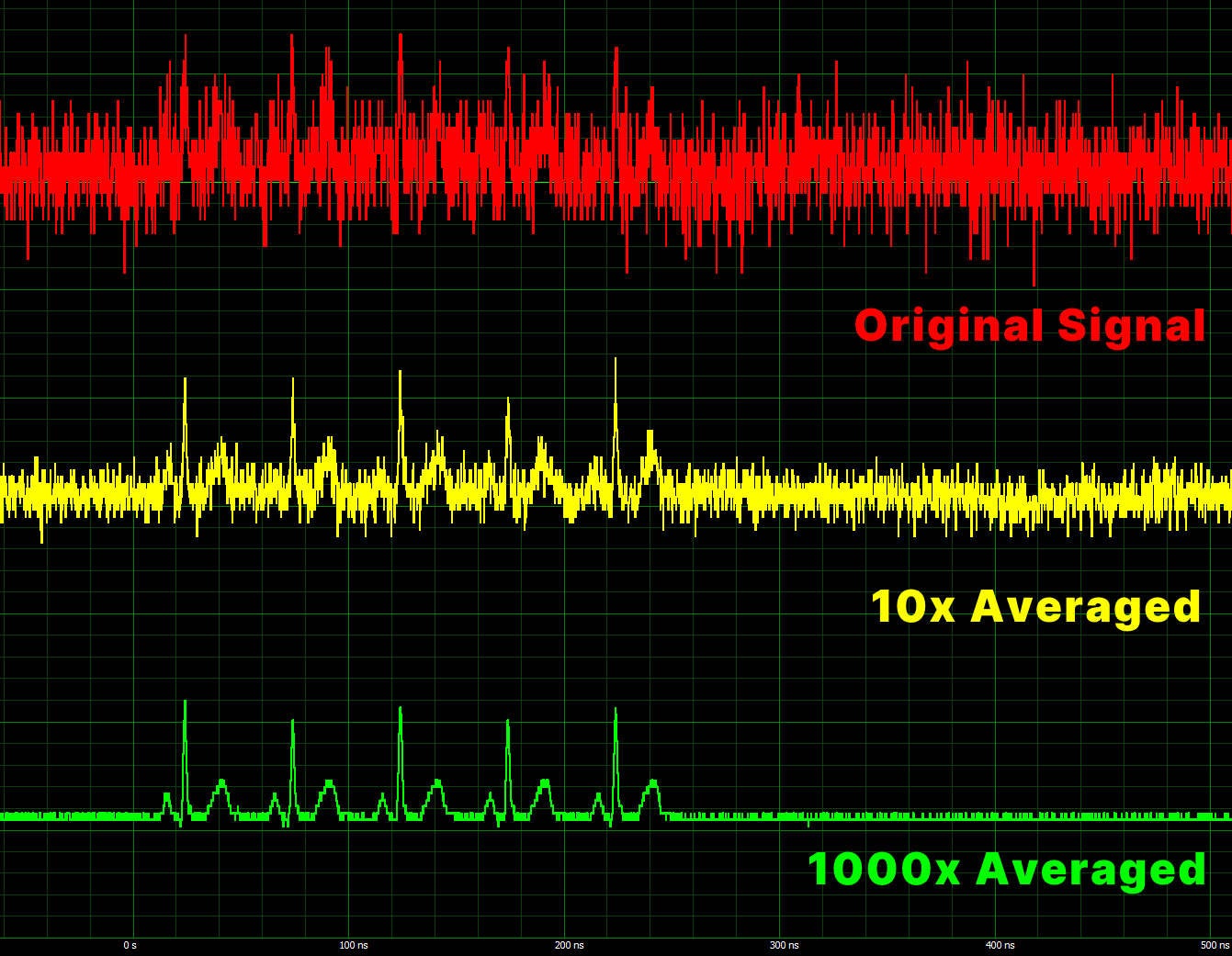 1,000回平均化すると、信号品質がさらに向上し、二次的な最大ピークと最小ピークを持つ実際の信号の形状が明らかになります(下段のトレース)。