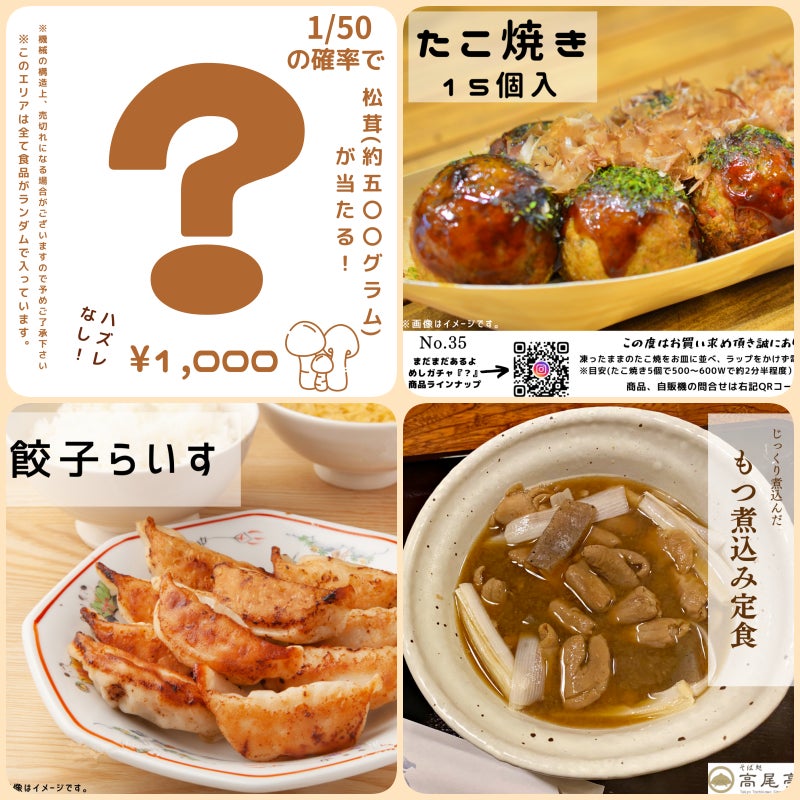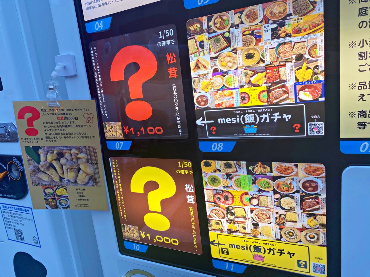 秋の味覚『大盛り松茸(約500g)』が1,000円で当たる?!冷凍自動販売機の『mesi(飯)ガチャ』で今日のご飯を占おう!