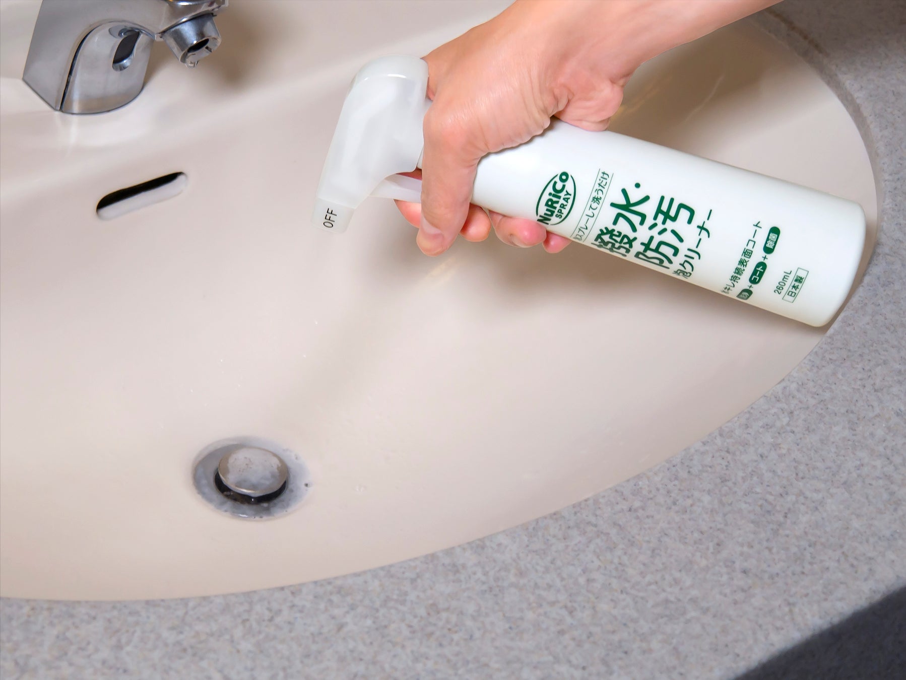 「ヌリコスプレー 撥水・防汚 泡クリーナー」は、週1回泡スプレーしてお手持ちのスポンジで擦ることで、洗面台、キッチンシンク、トイレなどの汚れを落とす洗浄効果に、コーティングの効果が加わることにより、日常のお掃除の回数と時間を少なくすることができます。