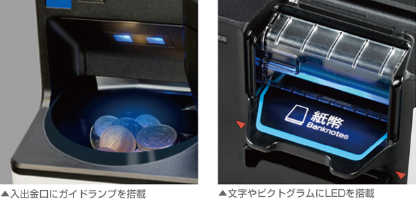 お客さまが会計時に操作を迷わないよう入出金口のガイドランプに加え、文字やピクトグラムにもLEDを搭載。