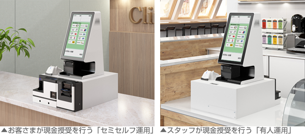 お客さま側の画面には、支払い方法の選択や店舗からのインフォーメンションを、スタッフ側の画面には、エラー解除ガイダンスなどの表示が可能です。また、スタッフ側の画面は、ボタンなどのレイアウトが自由に設定できるため、店舗の運用にあった最適な画面内容に変更可能です。