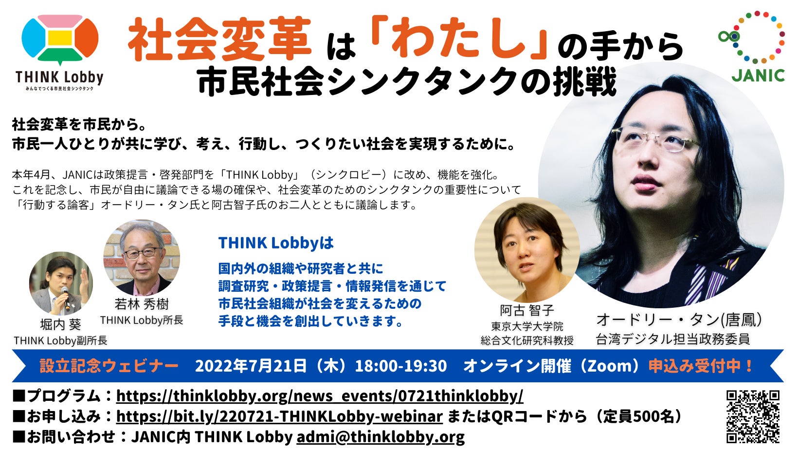 台湾・デジタル担当政務委員オードリー・タン氏*、東京大学大学院総合文化研究科教授阿古智子氏をゲストにお招きし、「社会変革と市民」をテーマに、市民が自由に議論できる場の確保や社会変革のためのシンクタンクの重要性について、それぞれのフィールドからの経験・事例を交えて講演とトークセッションを行います。