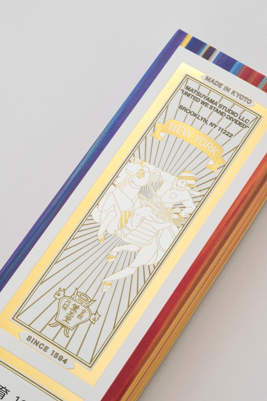 1594年に京都西本願寺前に薬種商として創業した香老舗薫玉堂と松山智一が協創した線香。薫玉堂が松山の描く世界観に共鳴したことで、本展でのみ特別に販売されるデザインが実現しました。松山が用いるドリッピングという技法を再現した箱になっています。長い歴史を持つ薫玉堂のお香を象徴するデザインに、箔押しで松山の代表的なモチーフである騎馬像が描かれた本作は、まさに伝統を継承するTribute(トリビュート)的であり、本企画を象徴しています。