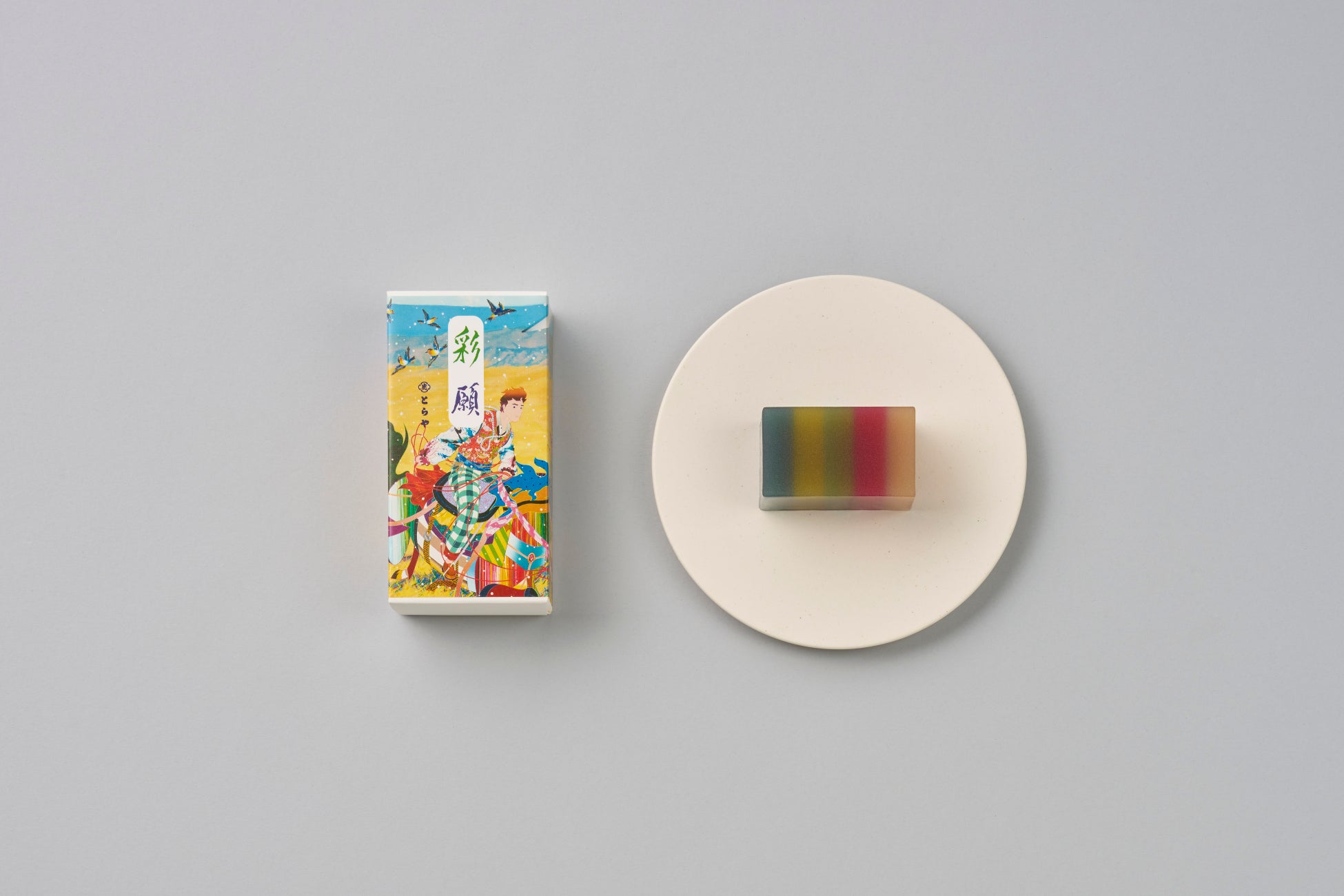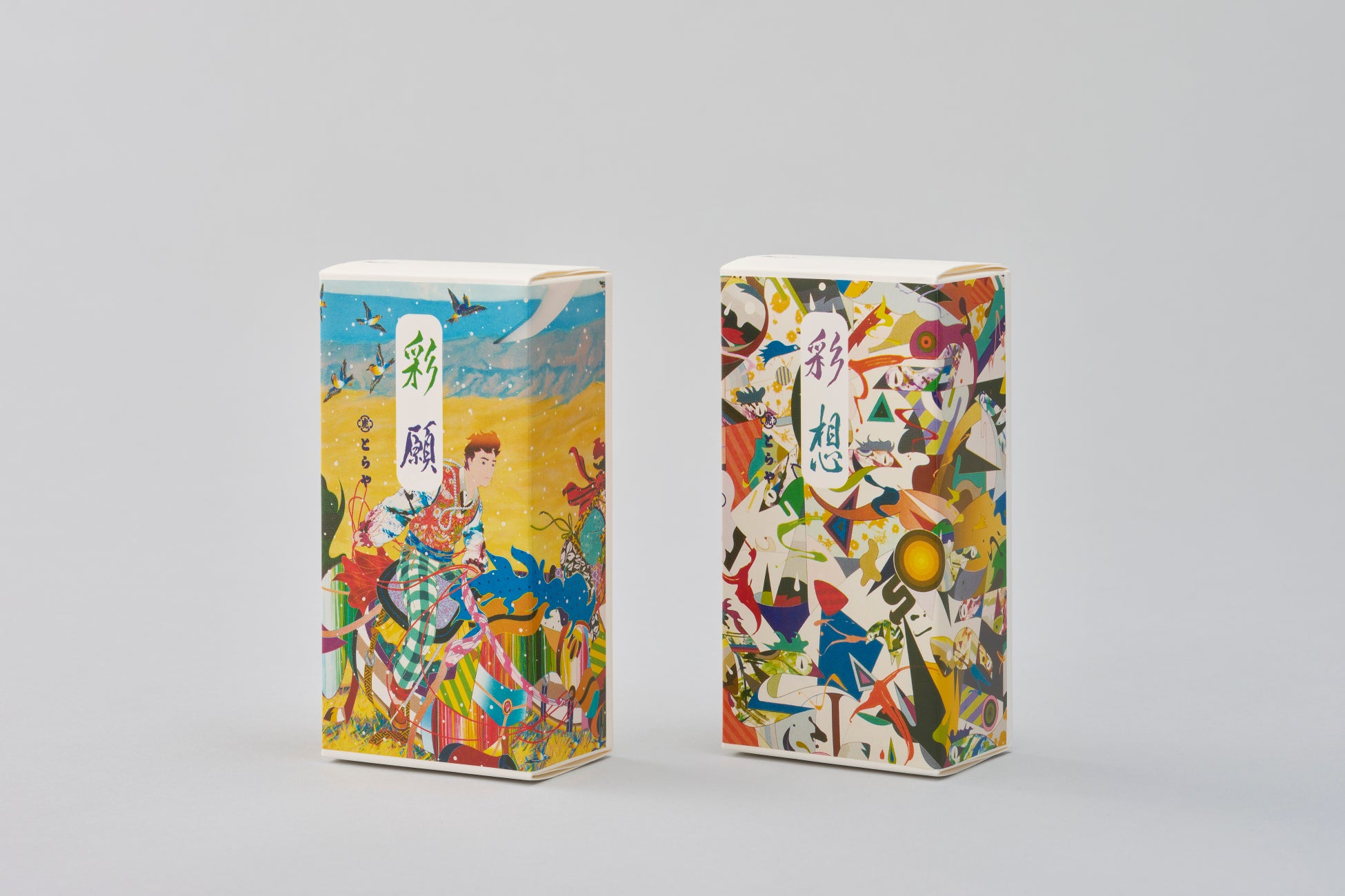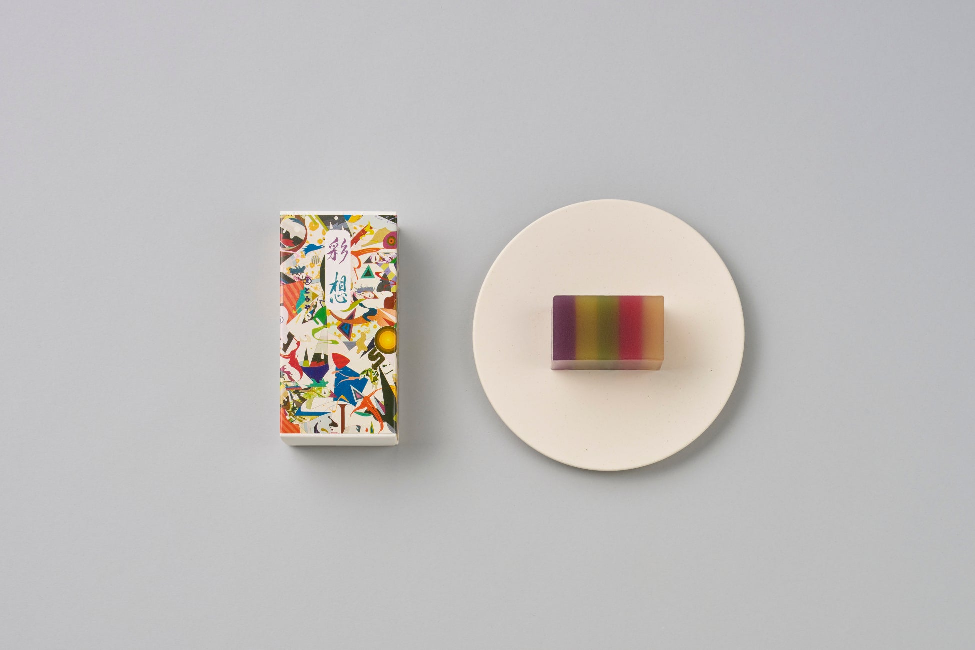《彩願》(いろどりねがひ)、《彩想》(いろどりおもひ)と銘が付けられた羊羹は、元々コロナ禍の2020年医療関係者へお配りするために、松山智一、KOTARO NUKAGA代表 額賀 古太郎、虎屋 18代・黒川光晴が共に作り上げた菓子。