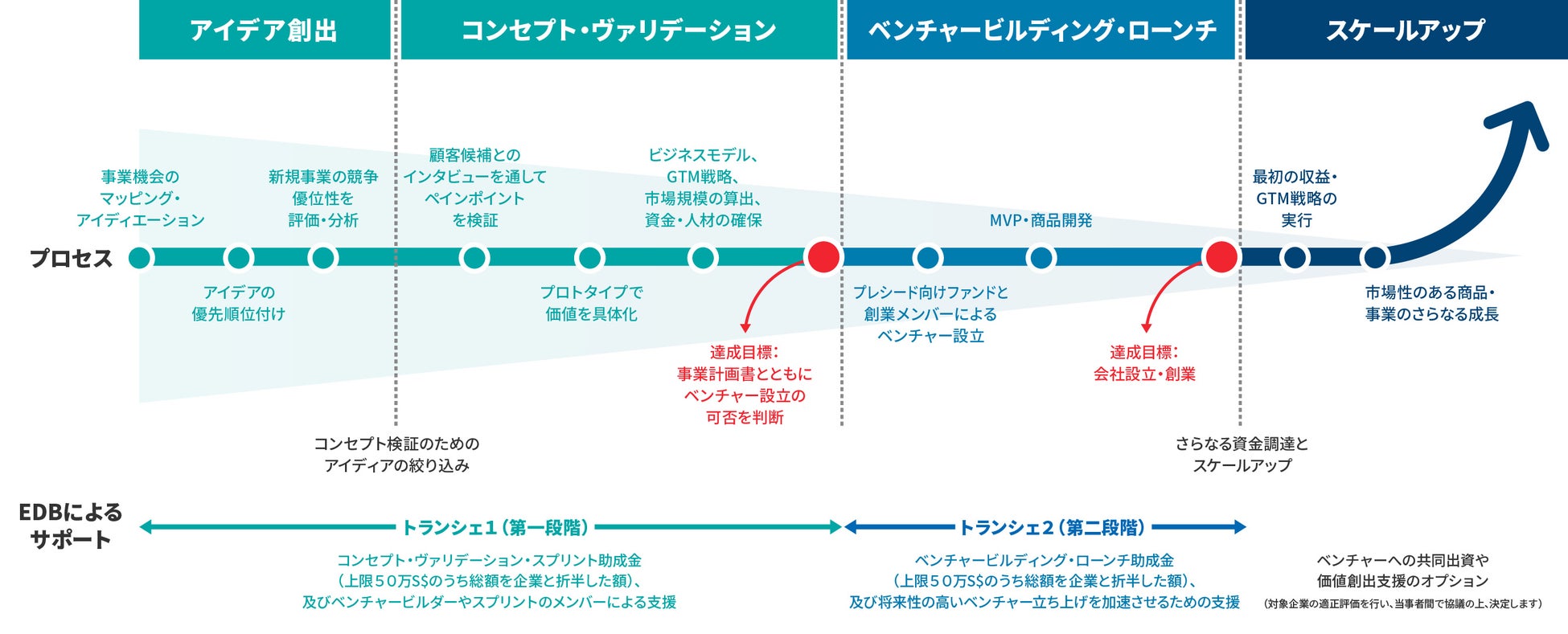 b.将来性の高いベンチャーに対しては、設立、必要最低限の機能を実装した製品の開発、創設メンバーの採用などを促進する「ベンチャービルディング・ローンチ(新規事業の立ち上げ・創業期)」の段階でかかる費用に対し、50万S$(約5000万円)のうち総額を企業と折半した助成金が追加で支給されます。