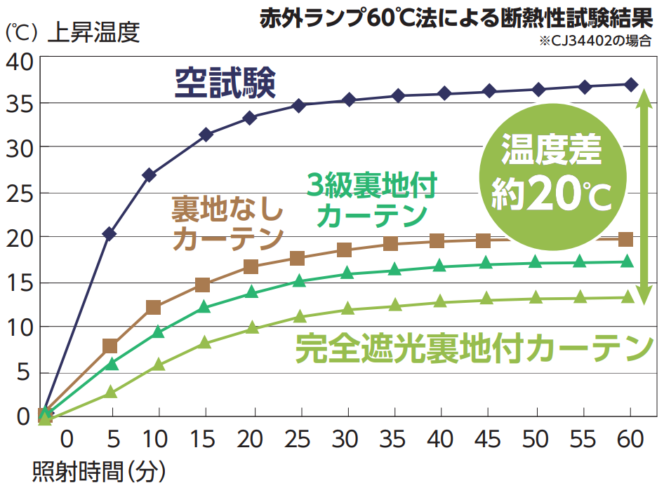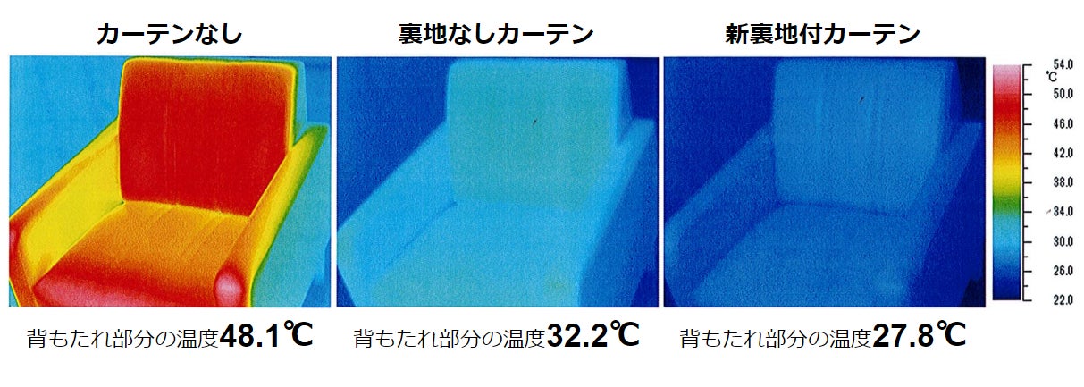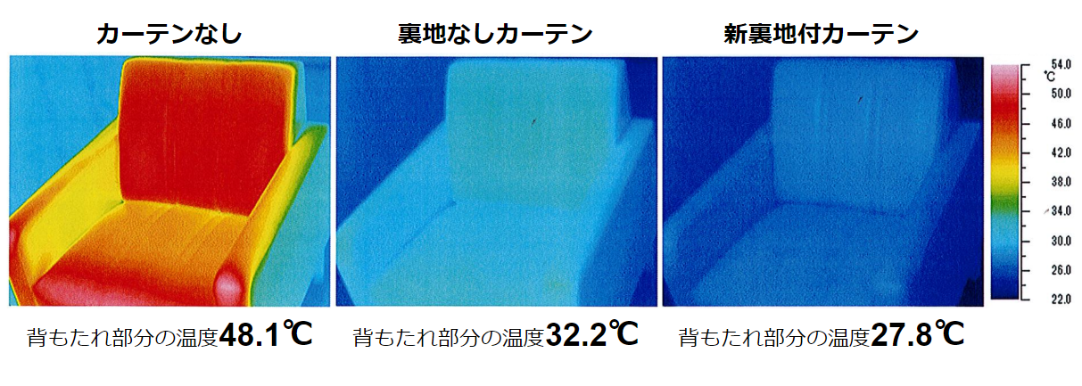 実験室に置かれたソファへ窓から投光機で60分間の照射を行ったところ、当初の温度(24.8℃)からカーテンなしの場合は48.1℃と20℃以上・カーテンありでも裏地がない場合は32.2℃と約8℃も上昇したのに対し、新裏地付カーテンは27.8℃とたった3℃の上昇に留まりました。 ※当社比