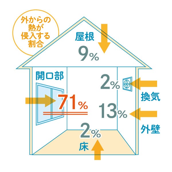 屋根や外壁などを通じて外部の熱が伝わることで室内温度は上昇しますが、熱の主な侵入口は窓です。夏場はなんと71%もの熱が窓を通じて侵入すると言われています。同時に窓はエアコンなどの冷気が逃げてしまう出口でもあり、節電において窓際の対策は必要不可欠です。