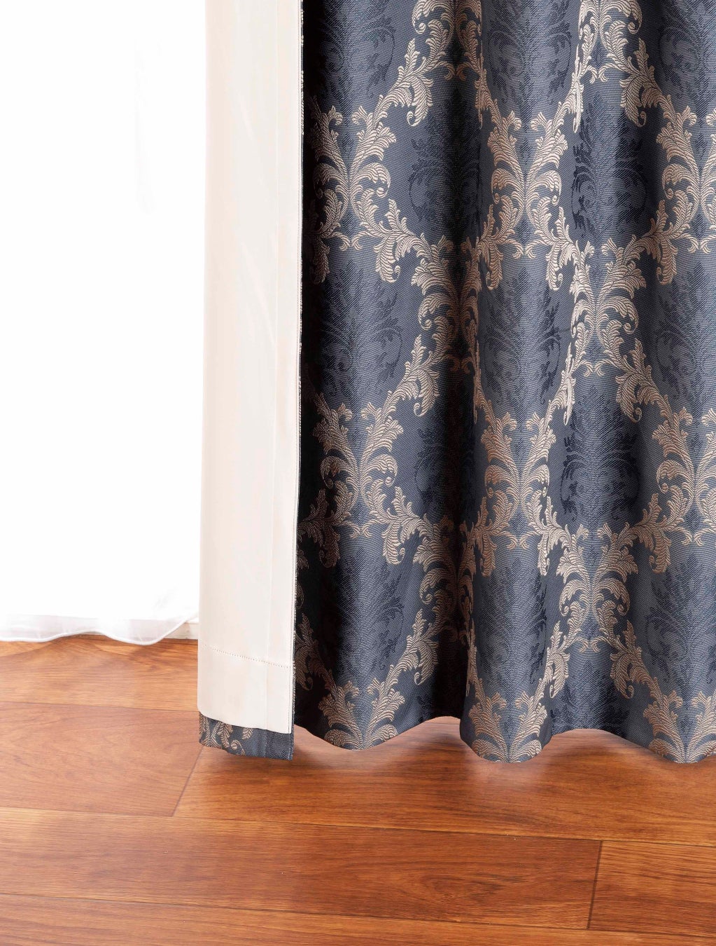 今までの裏地付カーテンは節電効果を⾼めるために⽣地を厚くし、遮光等級も⾼くする必要がありました。しかしこの度発売する新しい裏地付カーテンはフィルム裏地を採用したことで、完全遮光(⼀部縫製部分除く)かつ通常裏地と比較して優れた断熱効果を持つにもかかわらず軽いというメリットがあり、カーテン本来の⽣地の特性を損なうことなく優れた節電効果を発揮することができます。