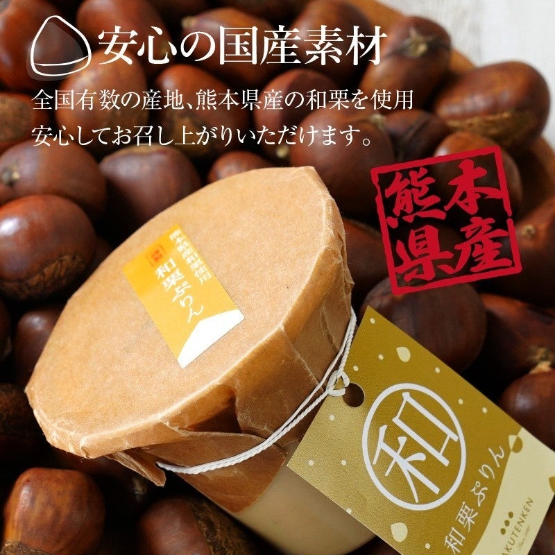 熊本は、世界最大級のカルデラを有する阿蘇や、美しい島々からなる天草に代表される素晴らしい自然にあふれています。また全国有数の名水にも恵まれており、豊かな土壌で育まれた「熊本県産の栗」は、前項で2位の生産量と西日本一の生産量を誇ります。昨今の和栗ブームの影響で和栗の入手が困難な中、RAKUTENKENでは、贅沢にも熊本県産の和栗ペーストをたっぷりと使用、あえて渋皮を残した和栗ペーストにより、香り高く豊かな風味溢れる「和栗ぷりん」が誕生しました。