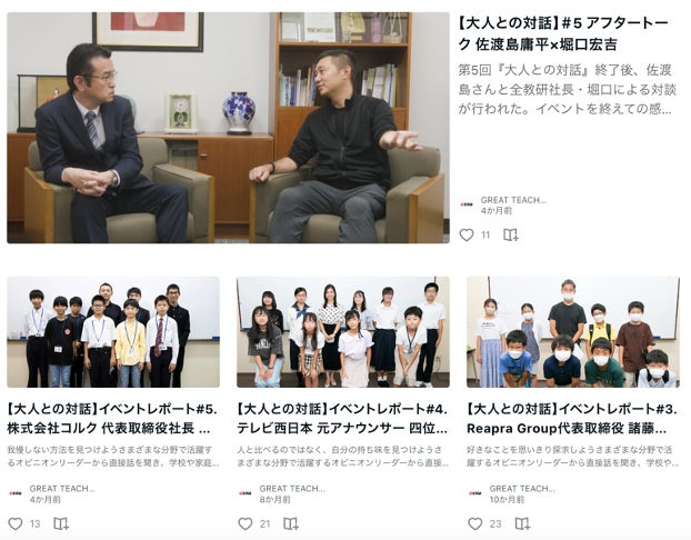 全教研では、“将来へつながる学び”としてさまざまなプロジェクトが進行中です。全教研生以外でも参加可能なプログラムもあり、実施レポートや募集告知をInstagramで公開しています。また、社会の第一線で活躍する大人と全教研生が少人数で対話をする“大人との対話”を中心に、全教研のnoteにて様子をご覧いただけます。