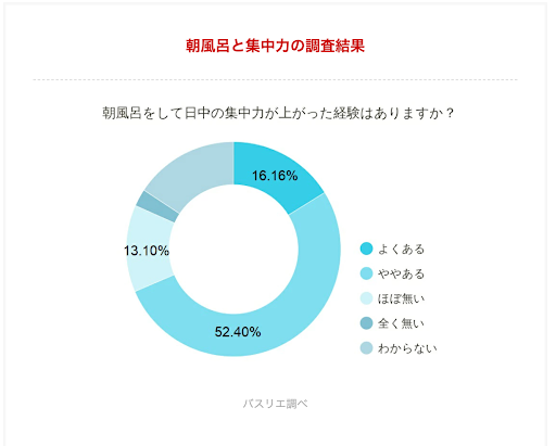 お風呂が体にいいことはもちろんですが、「朝入浴」を推奨しています。その根拠のひとつが、朝風呂に入るとスッキリ目覚めて体が活動モードになることです。朝風呂をしたことで日中の集中力が上がったことが、“よくある”と回答した人は16.16%、“ややある”と回答した人は52.4%で、なんと、66%の人が朝風呂の効果を感じていました。 一方“全くない”が2.62%、“ほぼ無い”が13.10%で合わせて約15%。 朝風呂が日中の集中力に良い影響を及ぼしていることが伺えます。