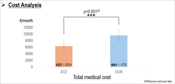 ICI治療期間中の1か月あたりの総医療費(平均値±標準偏差)は、ATZ-Gでは1,012,397±322,163円、DUR-Gでは1,536,132±283,228円でした(Wilcoxon順位和検定: P<0.001)。