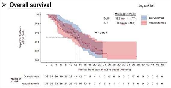 ATZ-G対DUR-GのOS中央値は、それぞれ11.9か月(95%信頼区間[CI]: 7.0- 18.5)対13.6か月(95%CI: 11.1- 17.7)で有意差は認められませんでした(P= 0.937)。Cox比例ハザードモデルによる分析では、OSに対してATZとDURの有意差は認められませんでした(ハザード比: 1.02、p=0.953)。