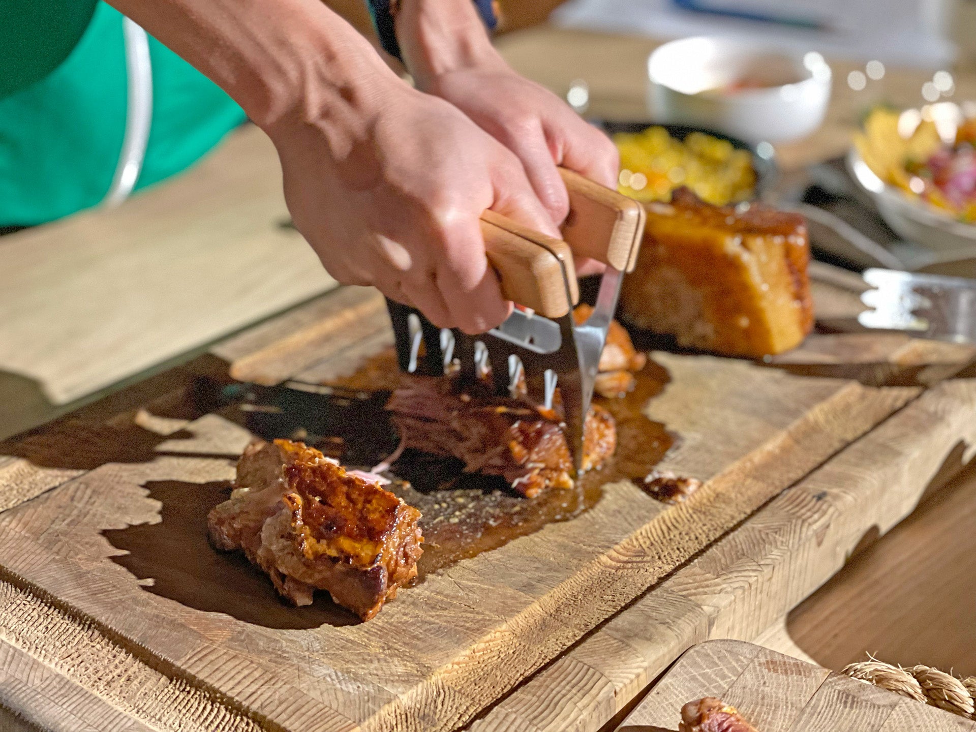 BBQの醍醐味でもあるプルドポークは、見た目が豪快な豚の塊(かたまり)肉を「ベアクロウ」と呼ばれる専用器具を使い、ご自身で切り裂きます。「見て楽しい、食べて楽しい、分けて楽しい」の3拍子そろっていて、本格的なBBQ体験に会話が弾み盛り上がります。