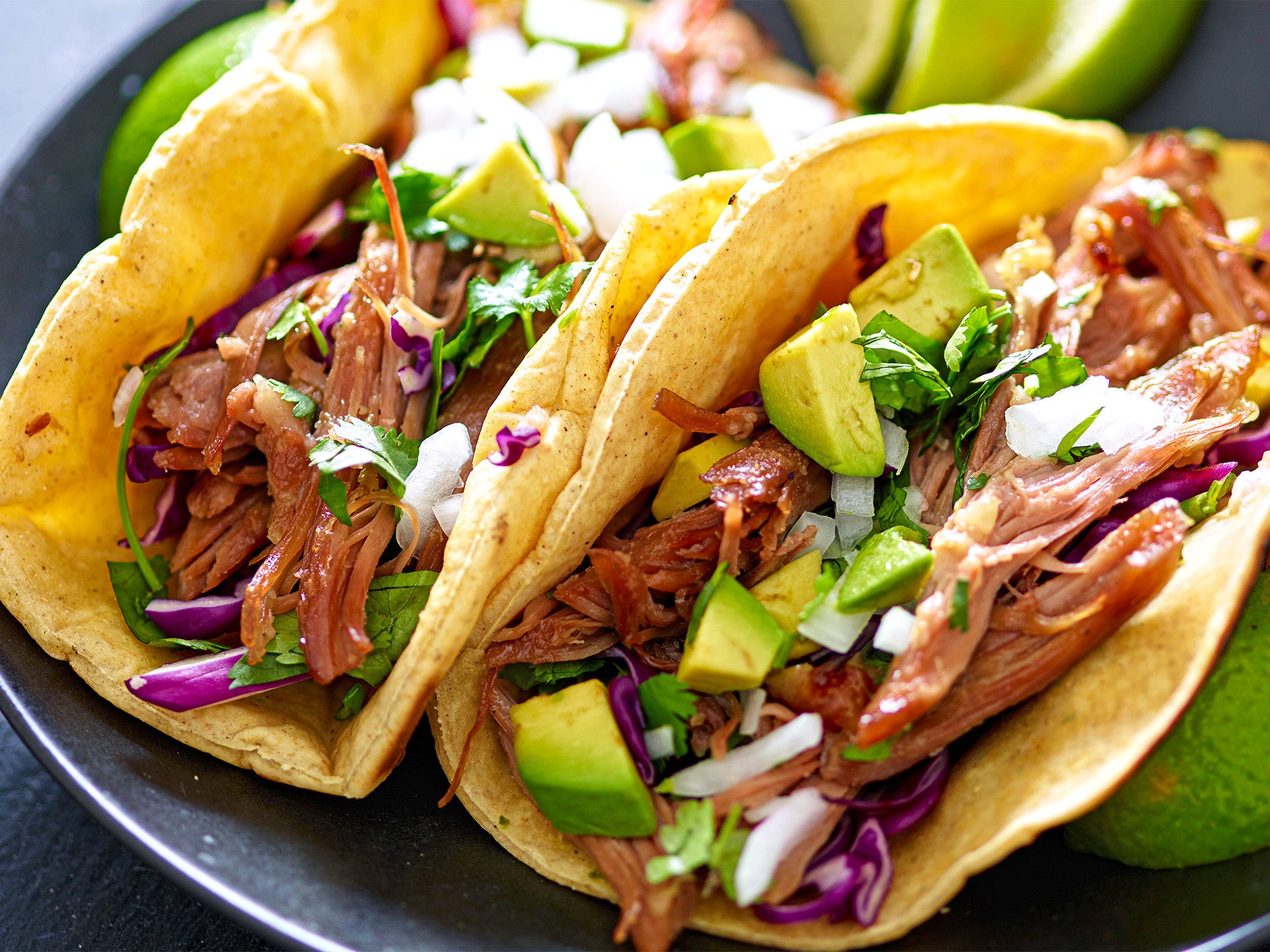 ・出来上がったプルドポークはタコス生地にのせて、カスタマイズ感覚でお好みの食材をトッピングして召し上がっていただけます。
