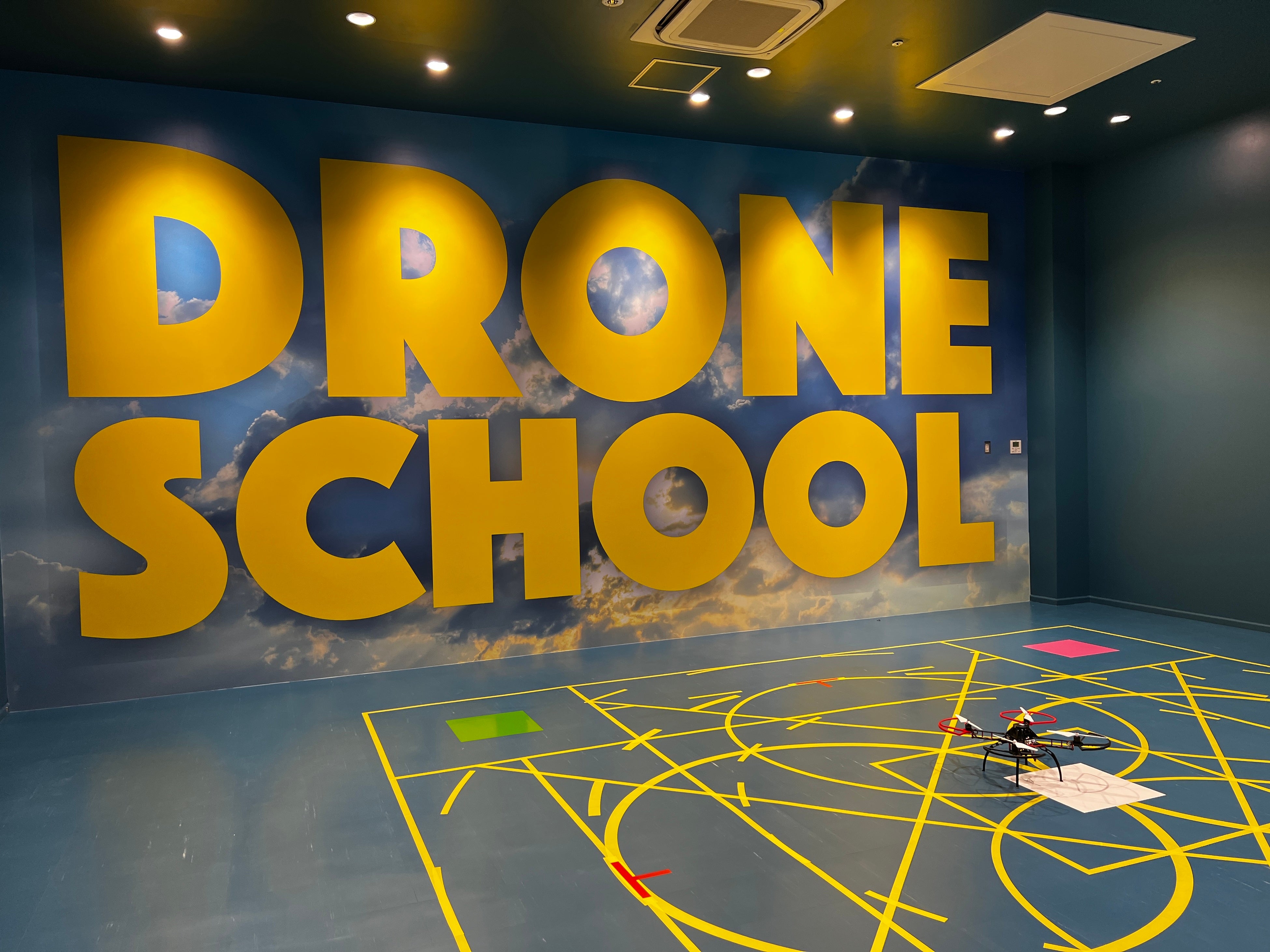 千葉県初、⼤型商業施設内併設型で全天候型に対応しており、更にイオンモール幕張新都⼼敷地内の臨時平⾯駐⾞場(3 188.96坪)も活⽤できるという屋内・屋外に対応したドローンを学ぶ上で、万全の環境を整えております。