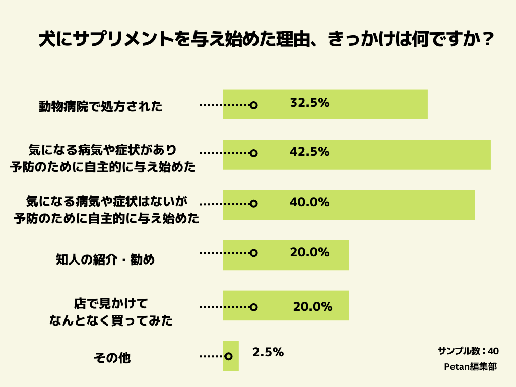 - 犬にサプリメントを与え始めたきっかけは「予防」が80%以上