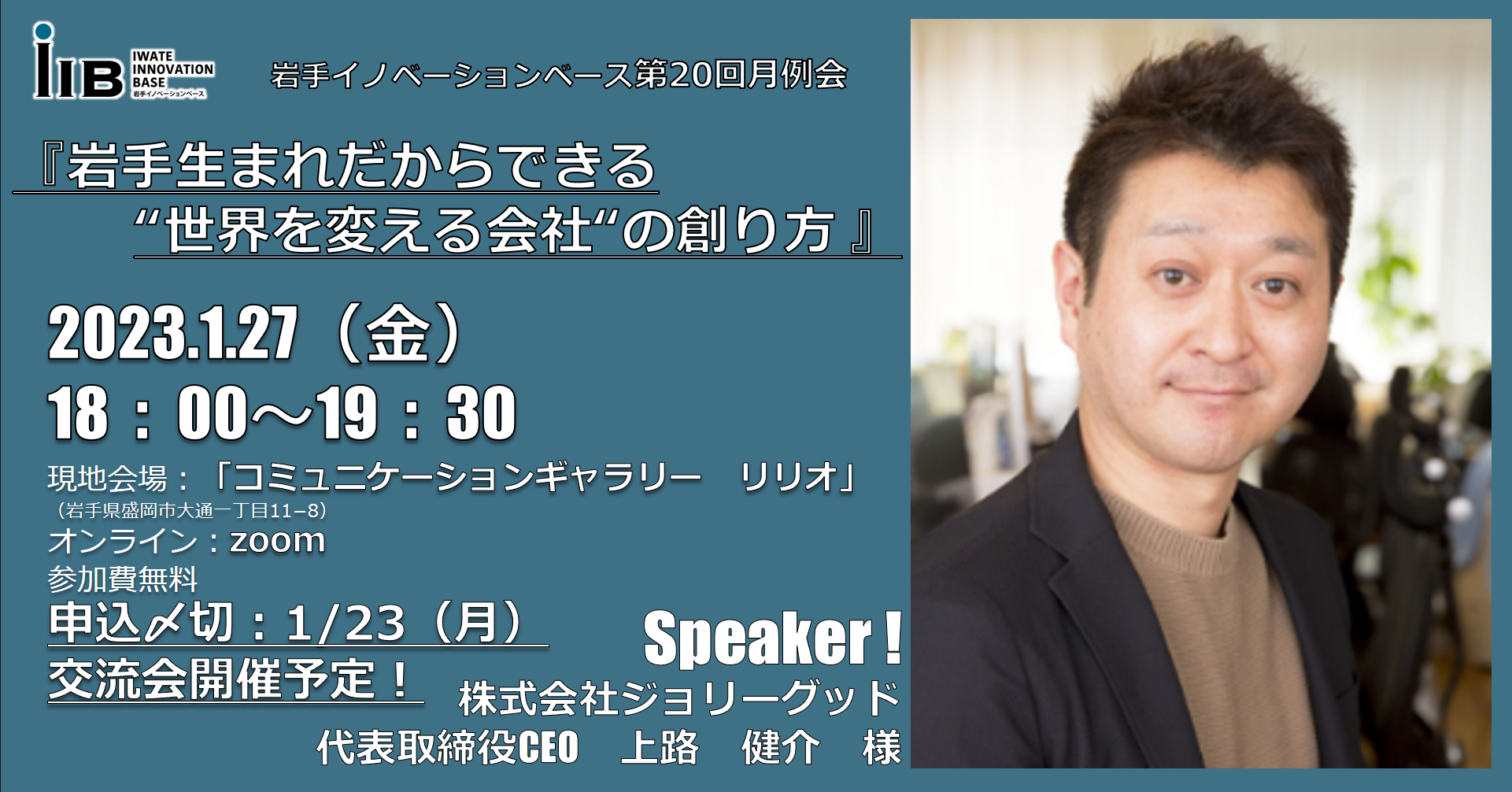 【岩手イノベーションベース】第20回月例会『岩手生まれだからできる“世界を変える会社“の創り方』(2023/1/27(金)18:00~@リリオ(岩手県盛岡市))を開催します!